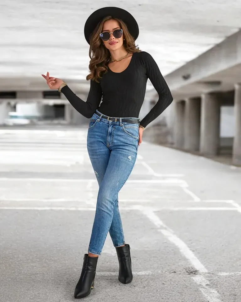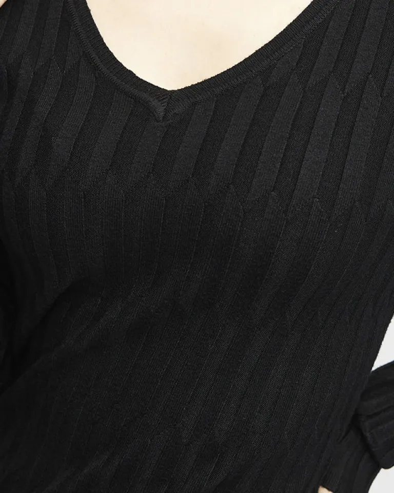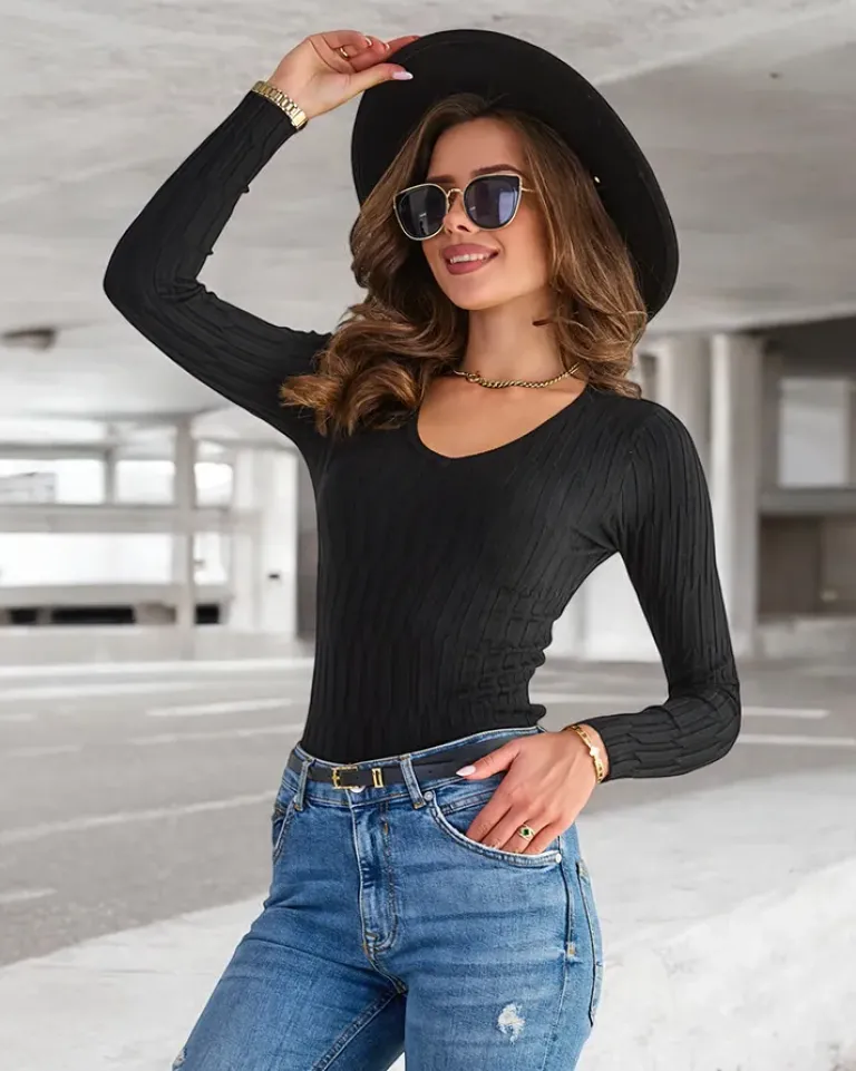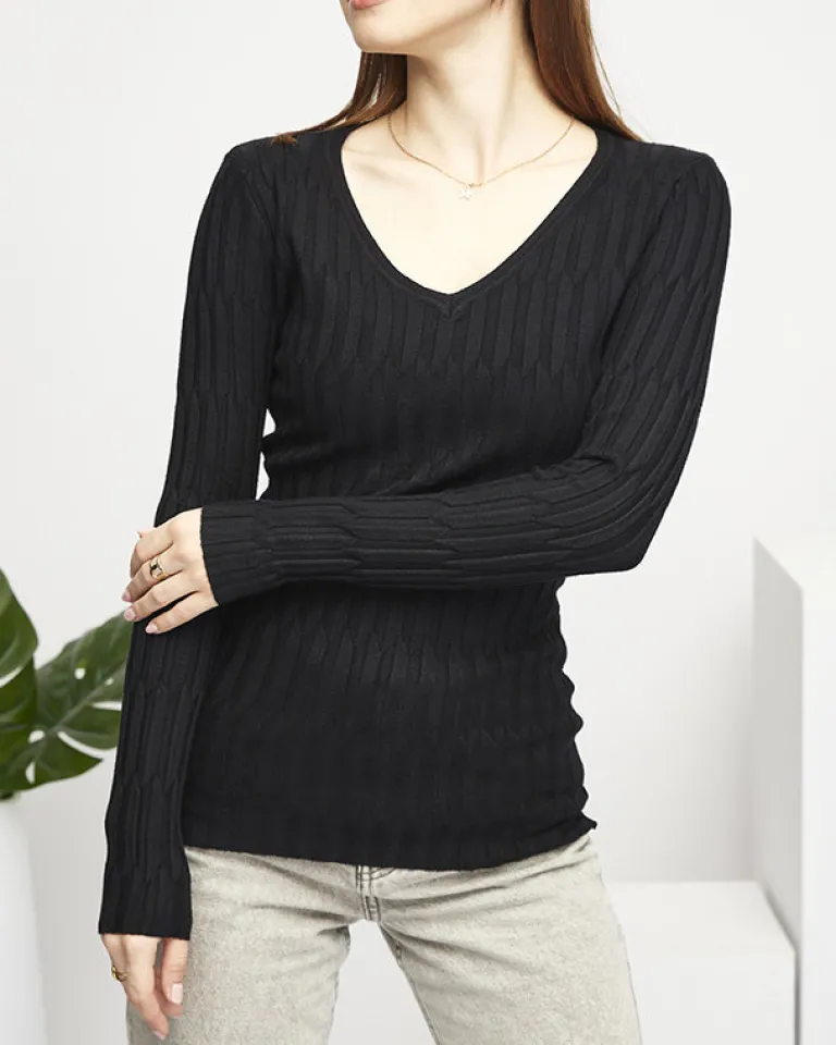 - Oryginalny damski sweter wykonany z przyjemnej, miękkiej tkaniny. Produkt posiada długie rękawy, dekolt w serek oraz jest zdobiony prążkami. Idealny wybór do jeansów jak i spódniczek! UWAGA: Dokładność pomiaru (+/-) 1 cm.