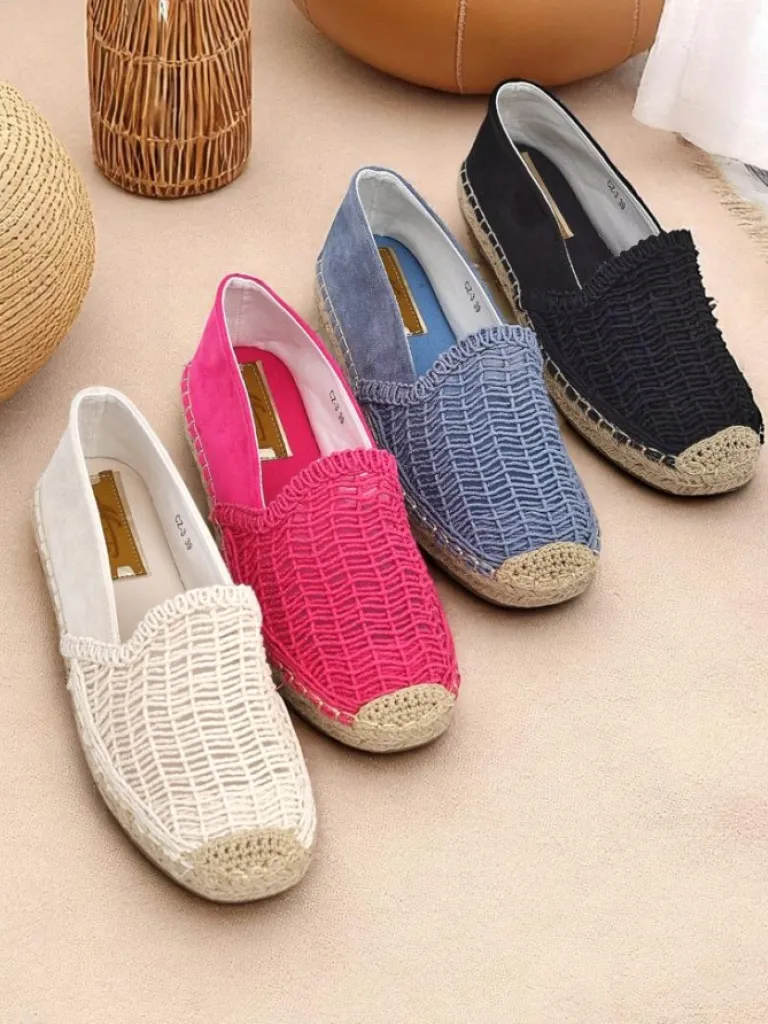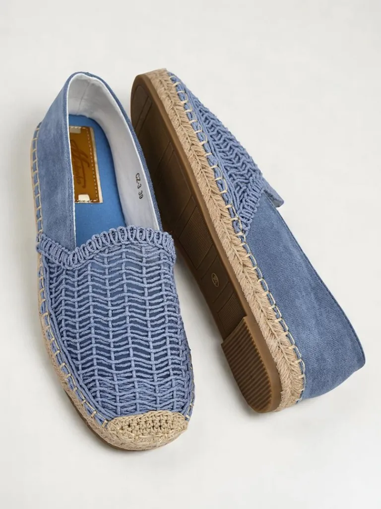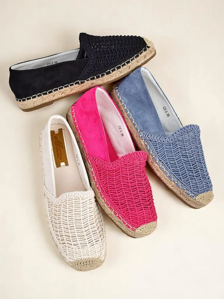 - Lekkie espadryle z eko zamszu i plecioną tkaniną na nosku. Jutowy sznurek na podeszwie dodaje uroku. Wygodne i stylowe – perfekcyjne na letnie spacery.