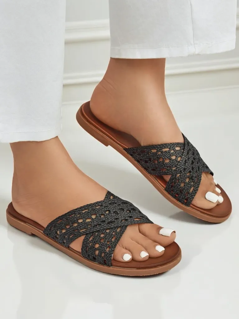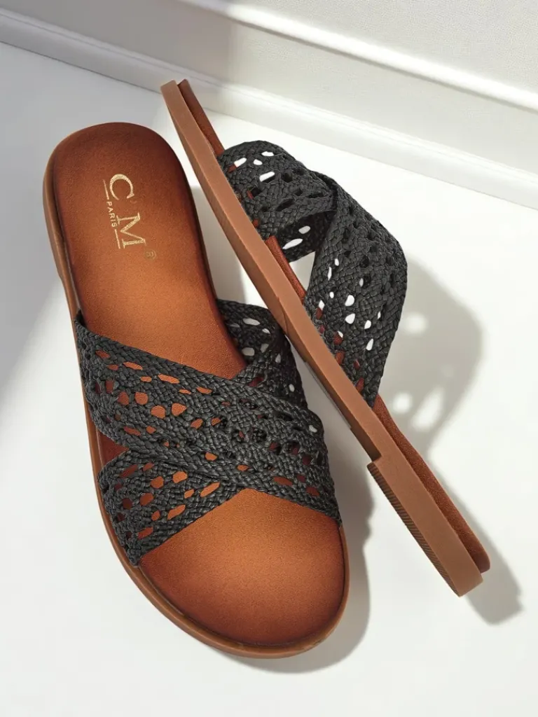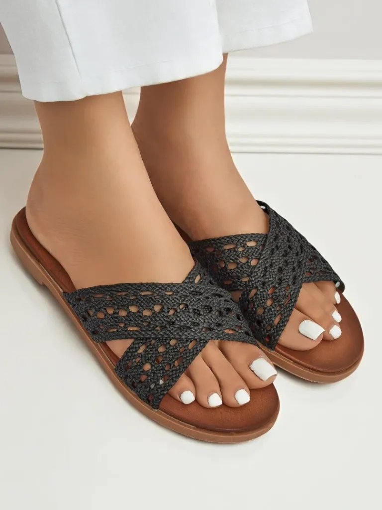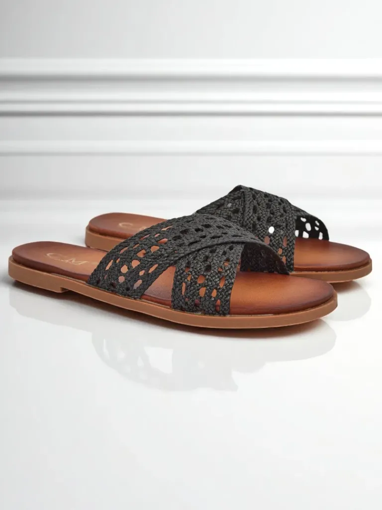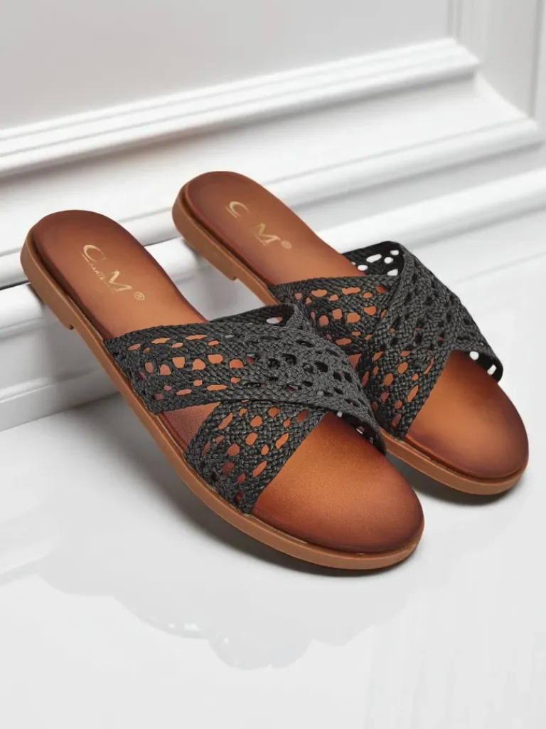 - Damskie klapki z eko skóry na płaskiej podeszwie z modnym plecionym detalem. Komfortowe i stylowe, idealne na lato i codzienne spacery. Lekka konstrukcja zapewnia wygodę przez cały dzień.