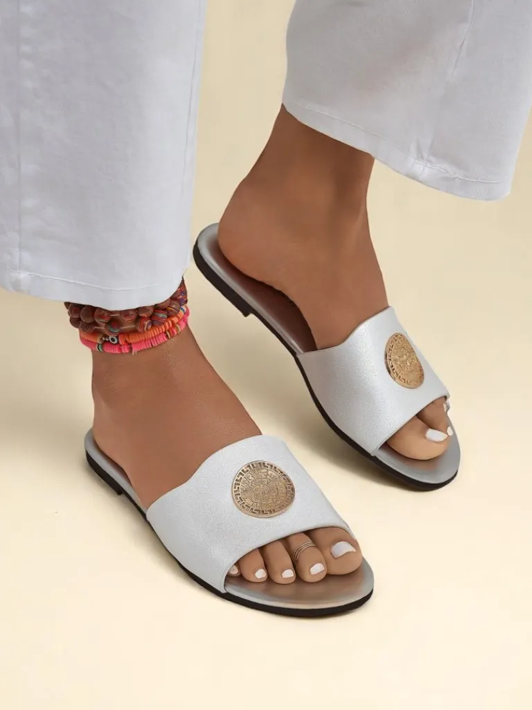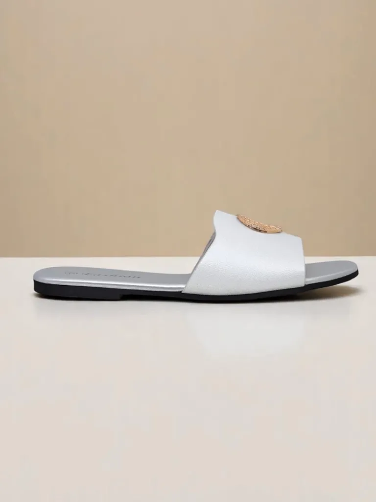 - Eleganckie klapki damskie z eko skóry na płaskiej podeszwie, zdobione złotą ozdobą. Komfort i luksus w jednym — idealne na letnie dni i stylowe wyjścia.