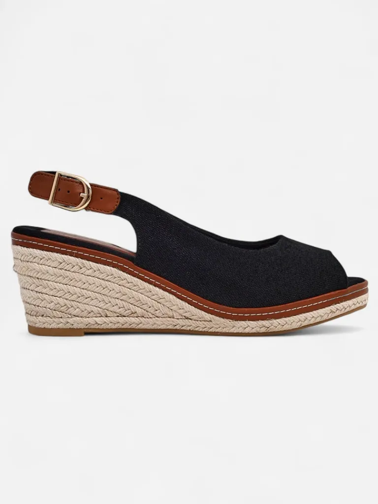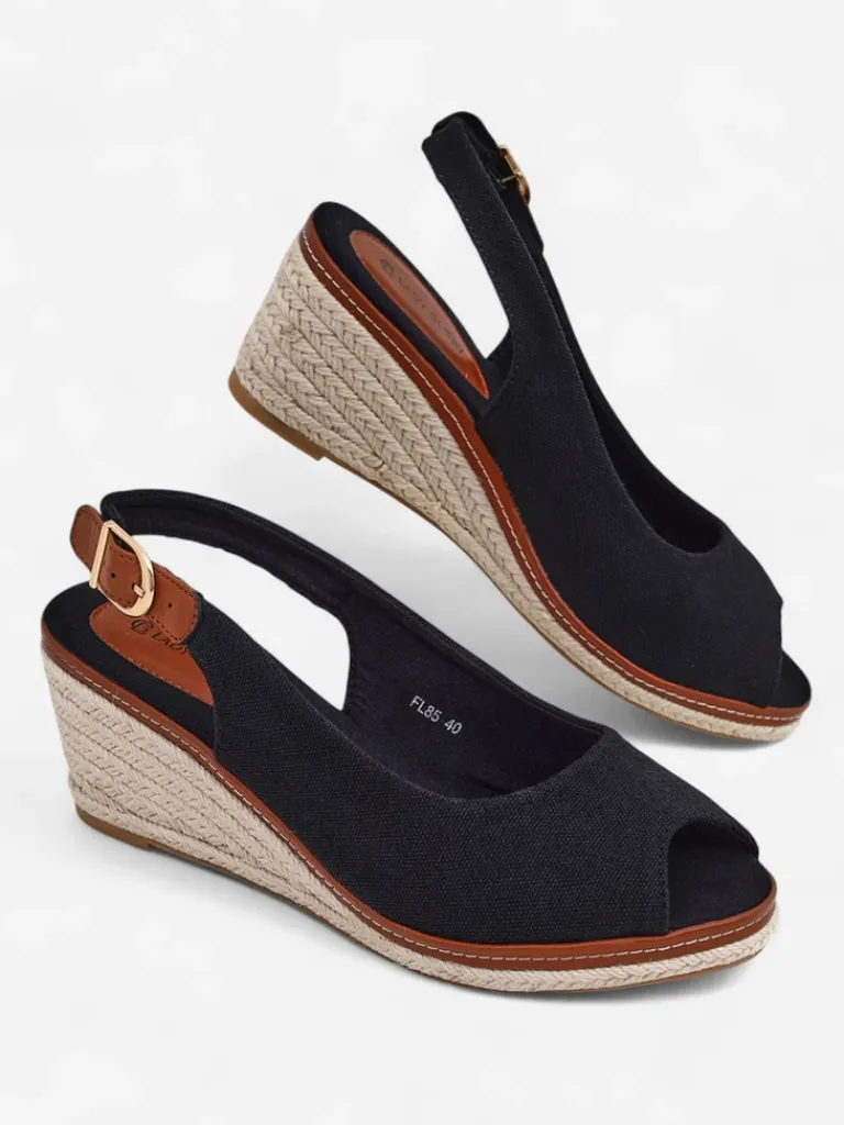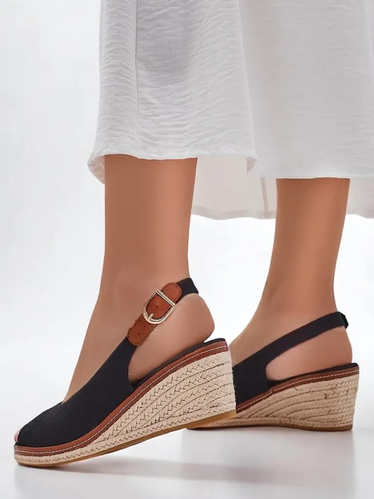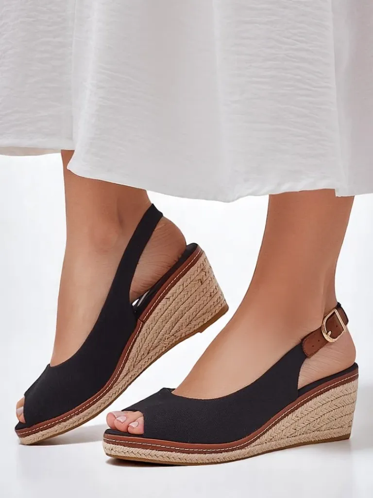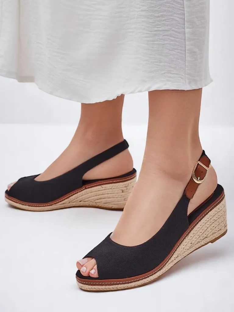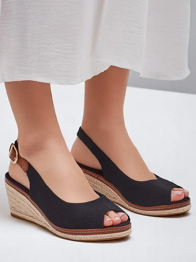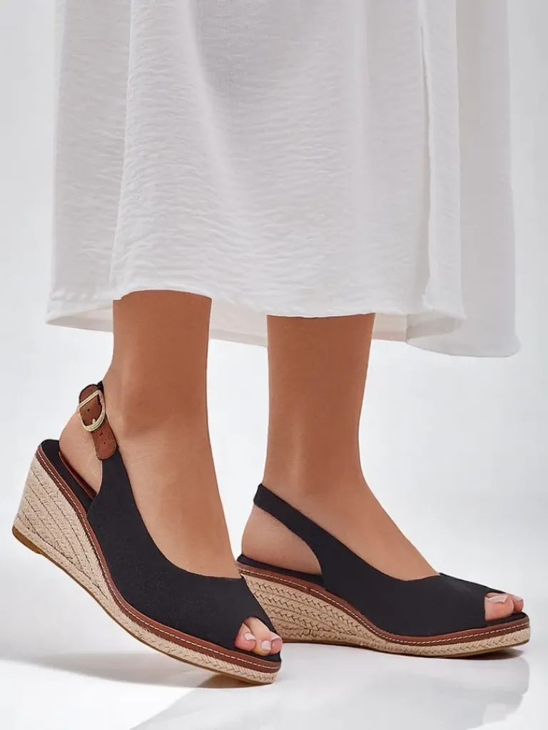 - Damskie sandały na koturnie wykonane z tkaniny. Obuwie posiada zapięcie na sprzączkę. Must have tego sezonu!