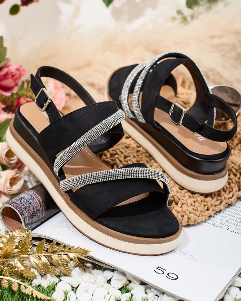 - Damskie sandałki na niskim koturnie. Wykonane są ze skóry ekologicznej, wkładka to eko skóra. Obuwie zapinane na sprzączkę, zdobione cyrkoniami. Doskonałe do tworzenia modnych letnich outfitów!