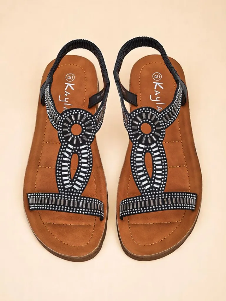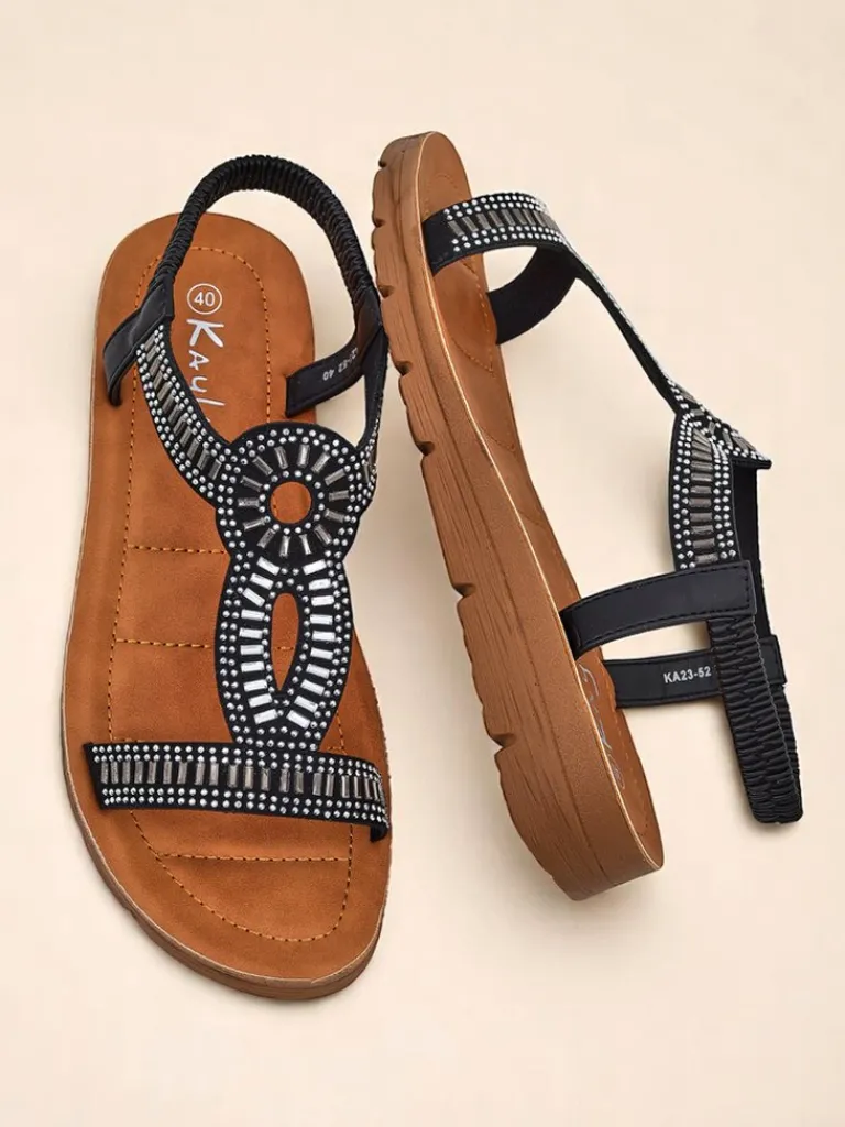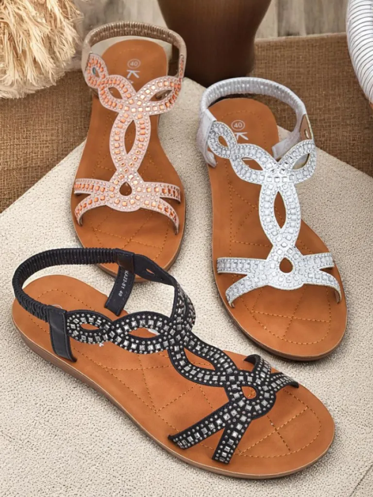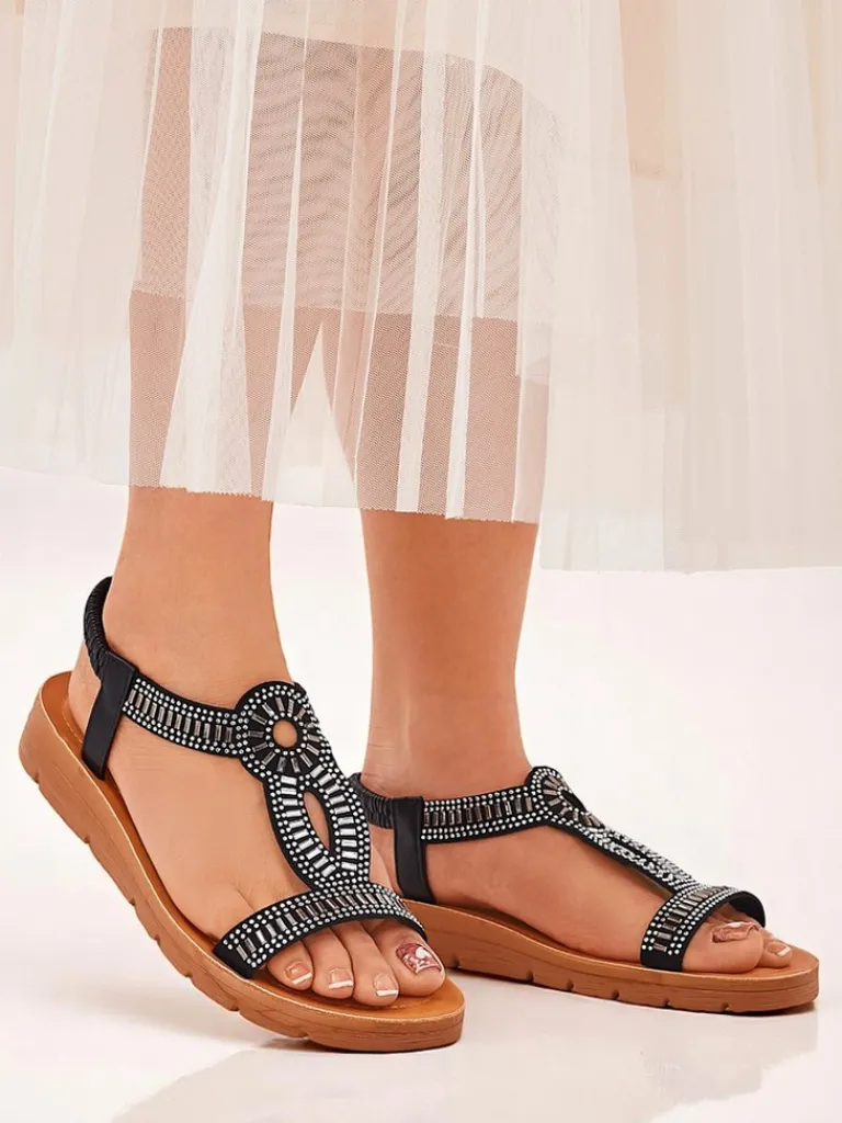 - Sandały damskie na płaskiej podeszwie z eko skóry, zdobione paseczkami z cyrkoniami. Połączenie wygody i subtelnego blasku, idealne na letnie dni i wieczorne wyjścia.