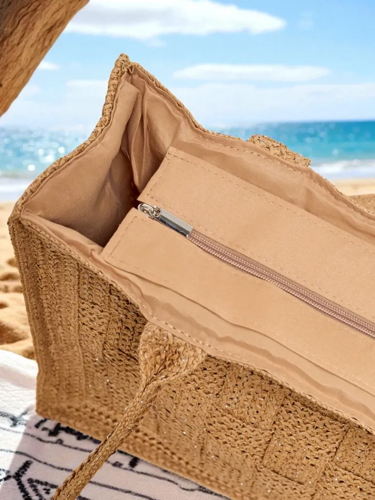 - Stylowa torebka słomiana z jedną komorą i kieszonką, zapinana na suwak. Lekka i przestronna, idealna na letnie dni. Doskonała do casualowych stylizacji, zapewnia wygodę i porządek, zachowując modny, wakacyjny urok. Perfect na plażę i miejskie spacery.