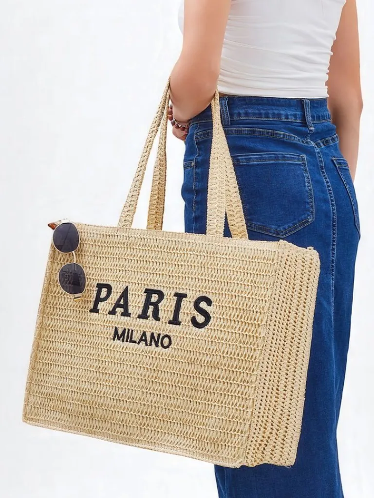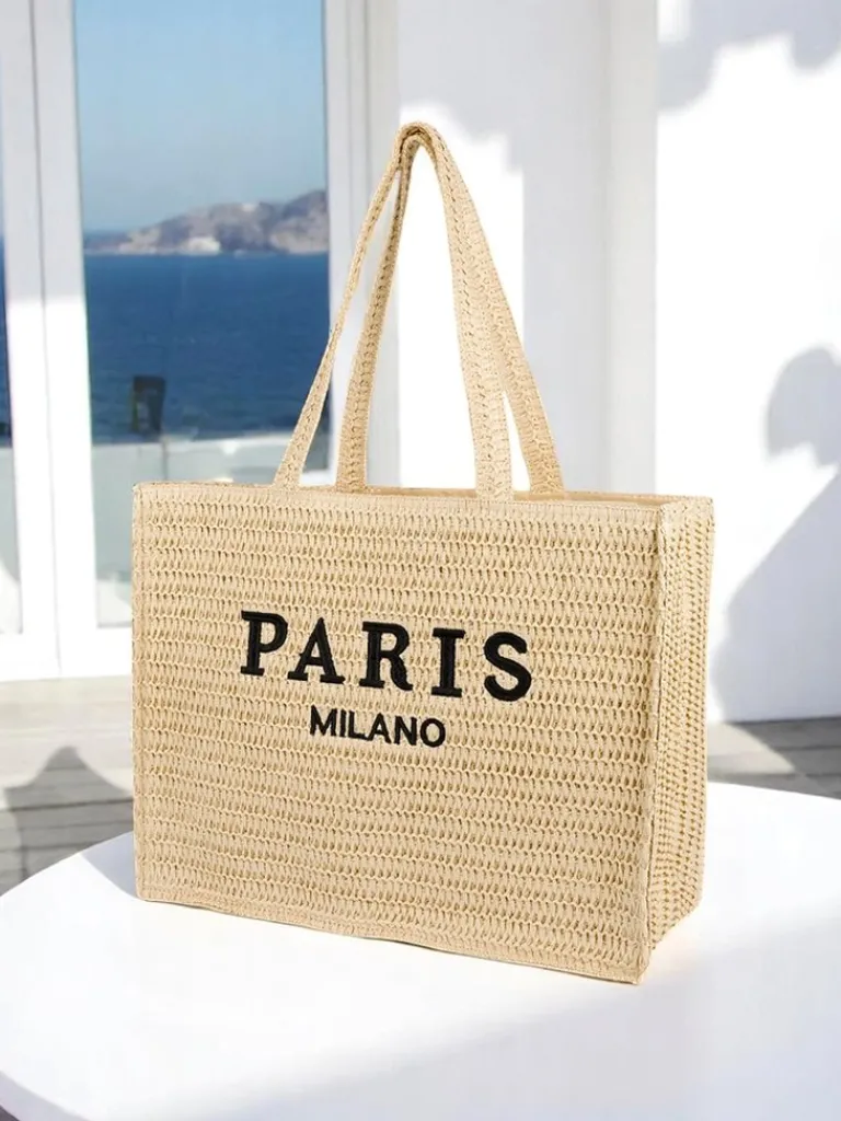 - Duża, pleciona torebka słomiana z napisem Paris Milano. 1 komora, kieszonka, zapięcie na zamek. Stylowa, pojemna i lekka – must have na lato i codzienne wyjścia!