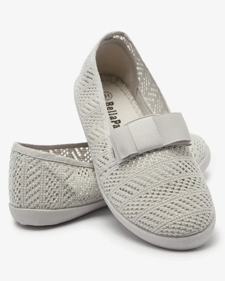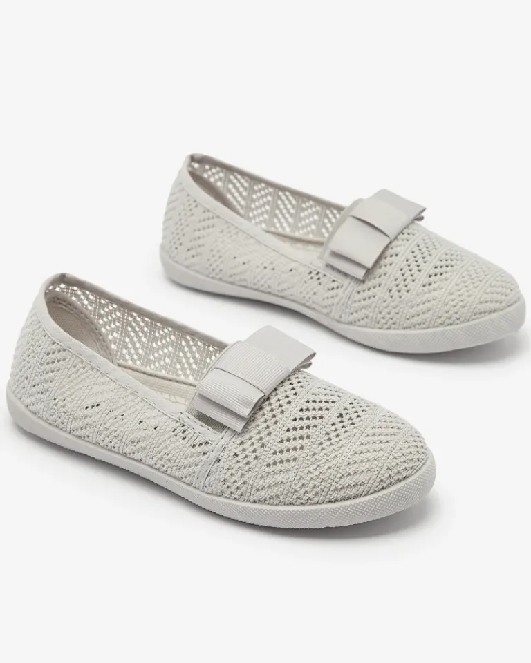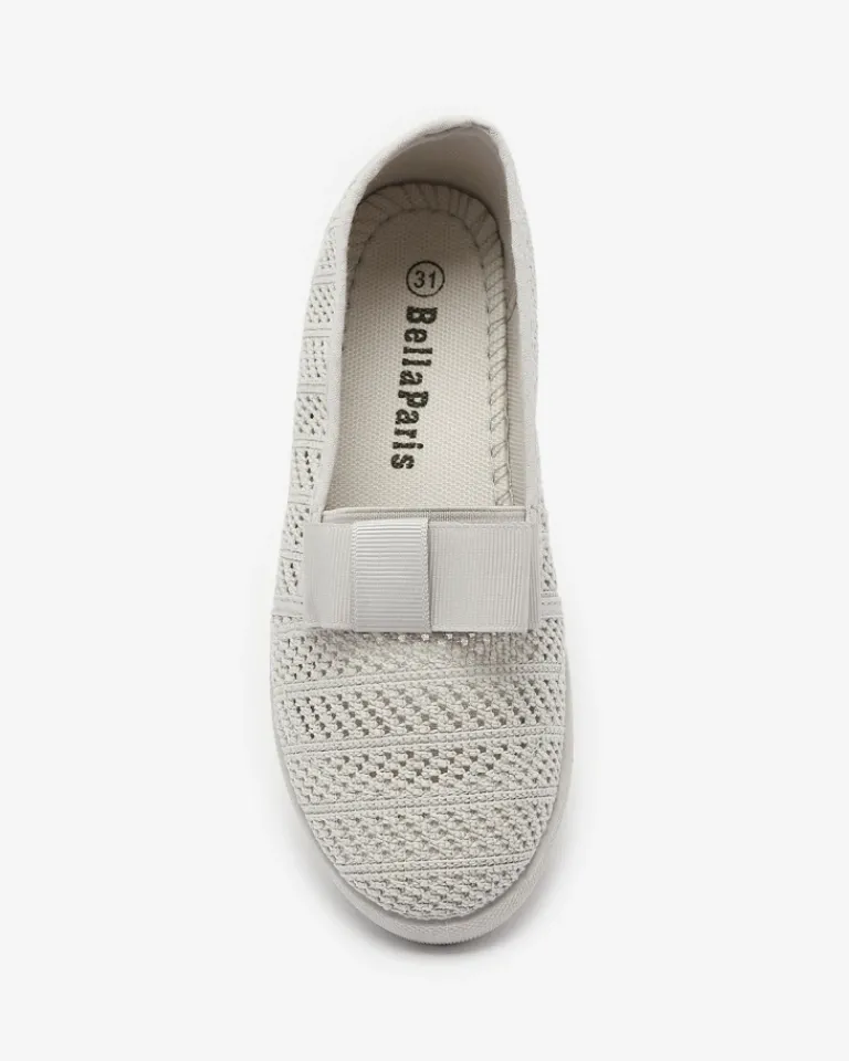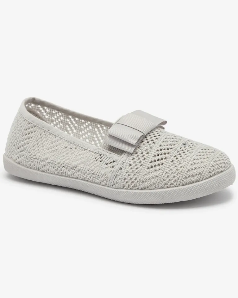 - Przepiękne dziewczęce tenisówki typu slip on. Cholewka wykonana jest z ażurowego materiału tkaninowego, wkładka to również tkanina. Para jest zdobiona uroczą kokardką z przodu. Dodatkowo obuwie posiada gumową wstawkę ułatwiającą wsuwanie stopy do buta.