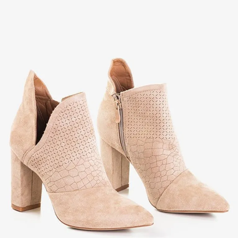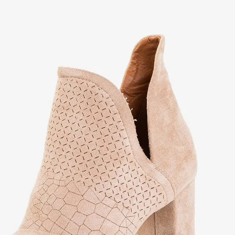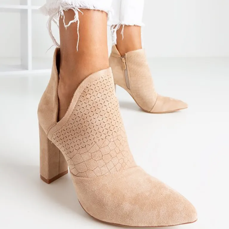 - Eleganckie damskie botki w kolorze jasnobrązowym na wyższym słupku. Model wykonany ze skóry ekologicznej zamszowej. Cholewka z wycięciem, zapinana suwakiem po boku, zdobiona geometrycznymi wzorkami. Wkładka tkaninowa. Idealne na jesień!