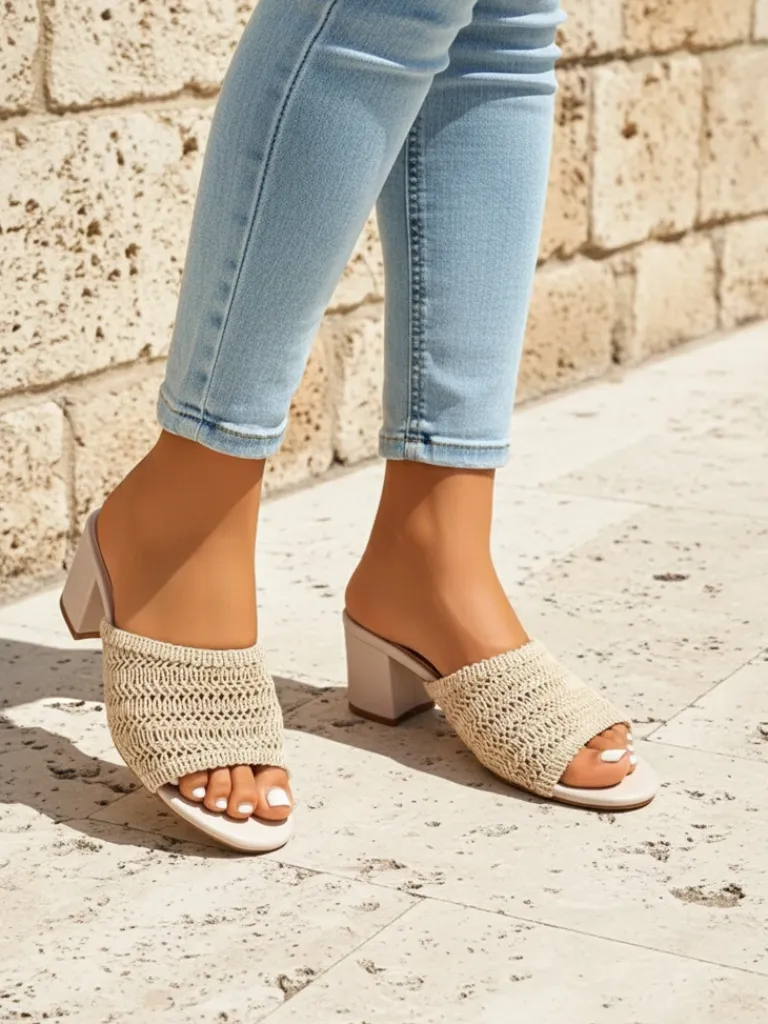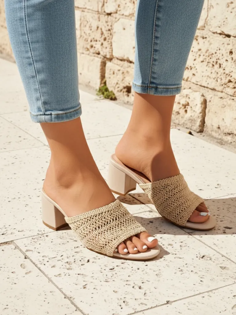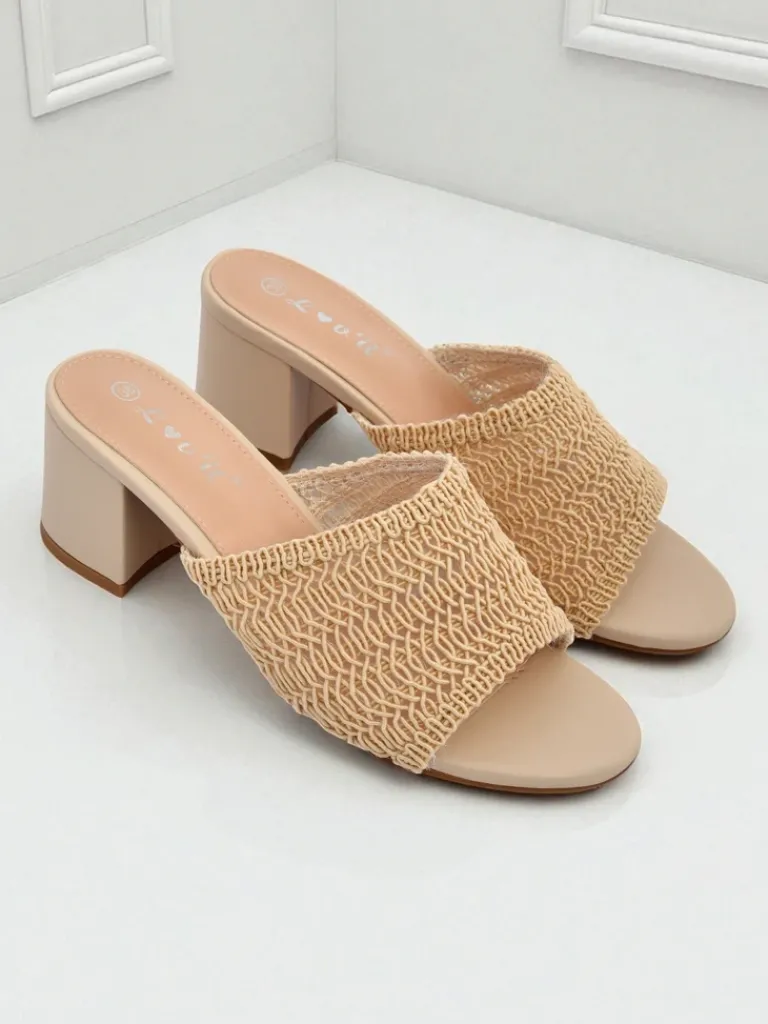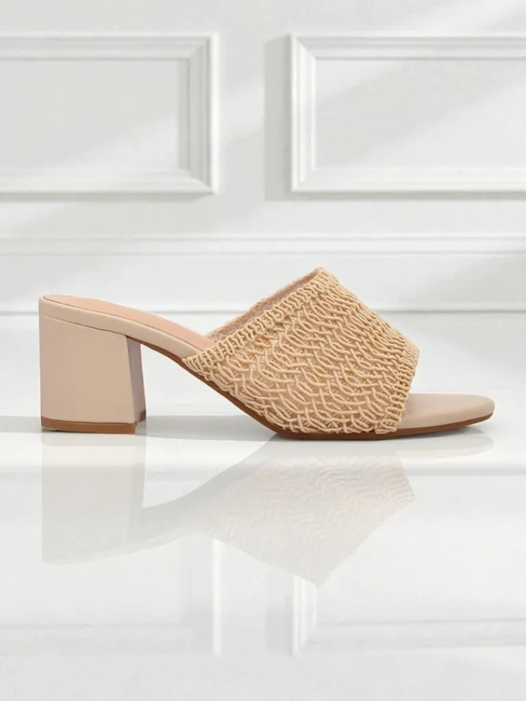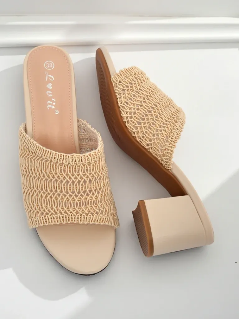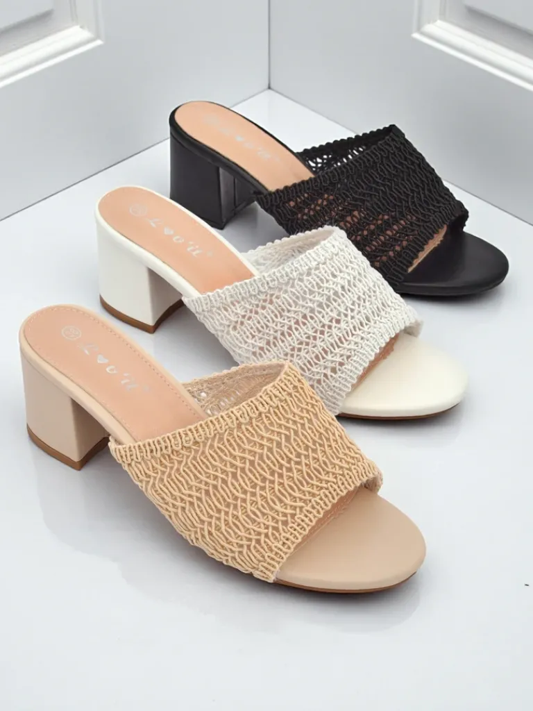 - Klapki damskie na obcasie typu słupek z wkładką wykonaną ze skóry ekologicznej i paskiem z tkaniny plecionej. Stylowy fason i wygoda – idealne do letnich sukienek i eleganckich stylizacji na co dzień.