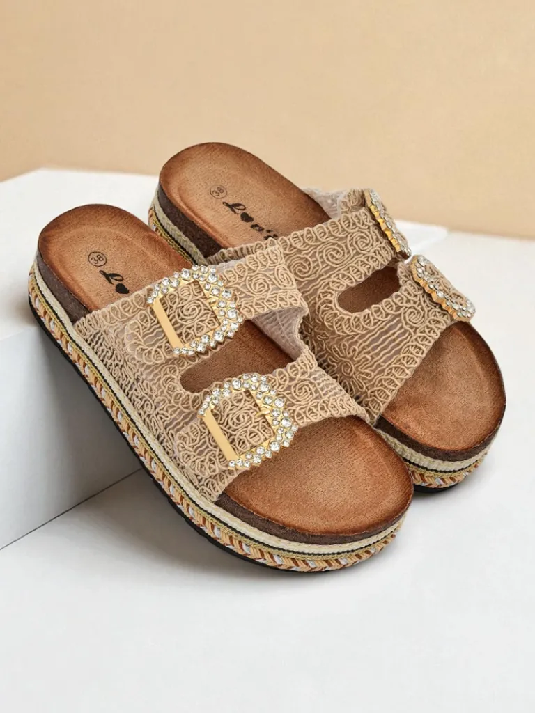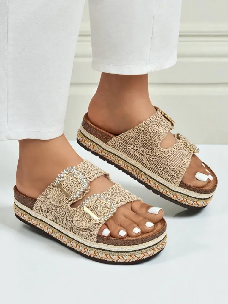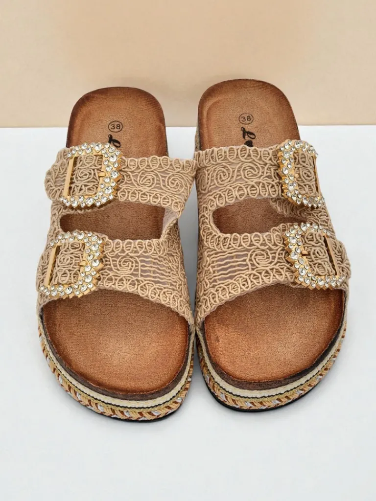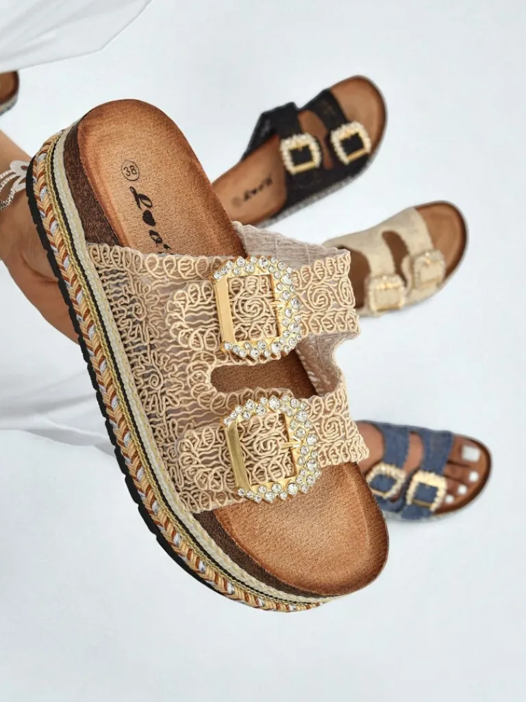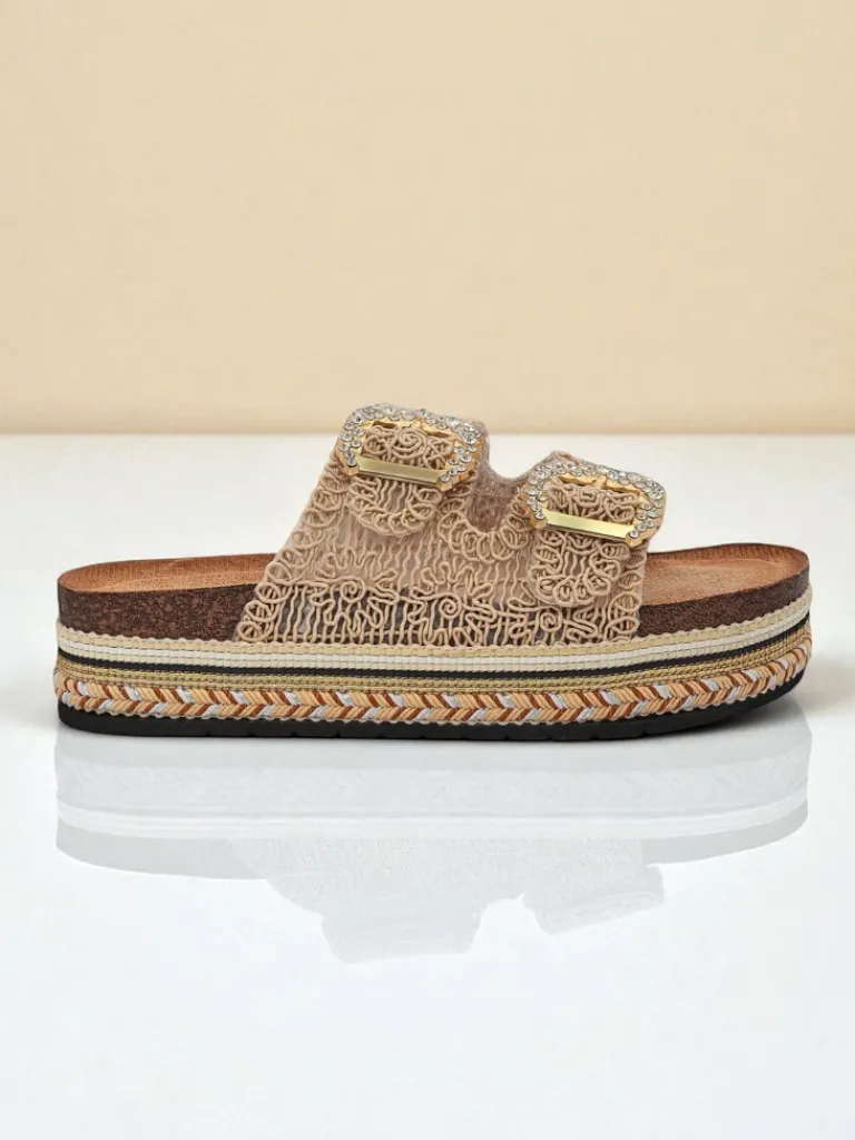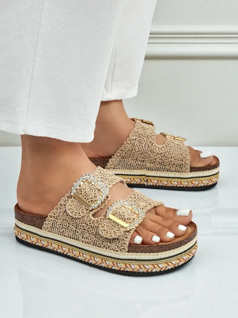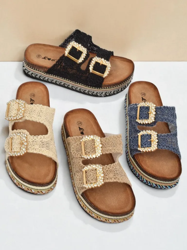 - Stylowe klapki na platformie à la korek, z plecionymi tkaninowymi paseczkami zdobionymi klamerkami z cyrkoniami. Wygodna eko zamszowa wkładka zapewnia komfort, a błyszczące detale dodają elegancji letnim stylizacjom.
