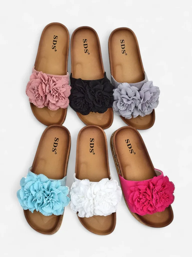 - Przepiękne klapki damskie wykonane ze skóry ekologicznej zamszowej, zdobione kwiatuszkami. Gumowa podeszwa zdobiona materiałem a’la korek i cyrkoniami. Model w ciekawej kolorystyce. Idealnie uzupełnią letnie stylizacje!