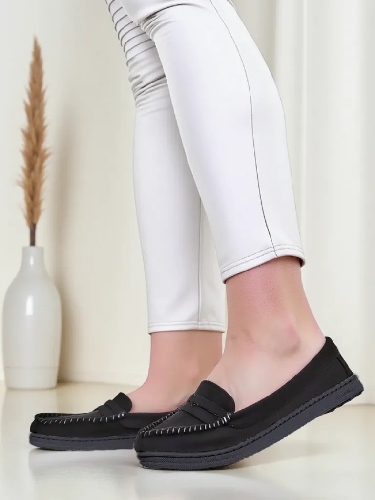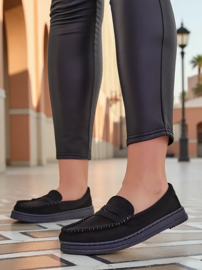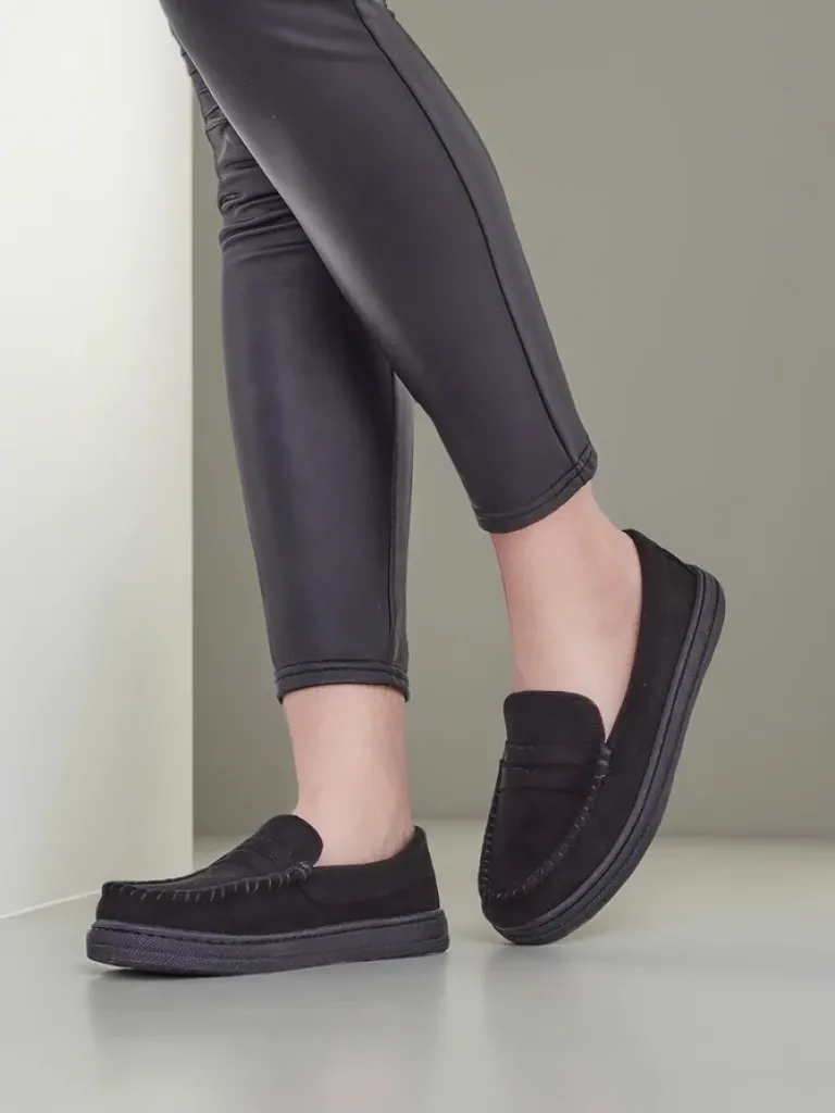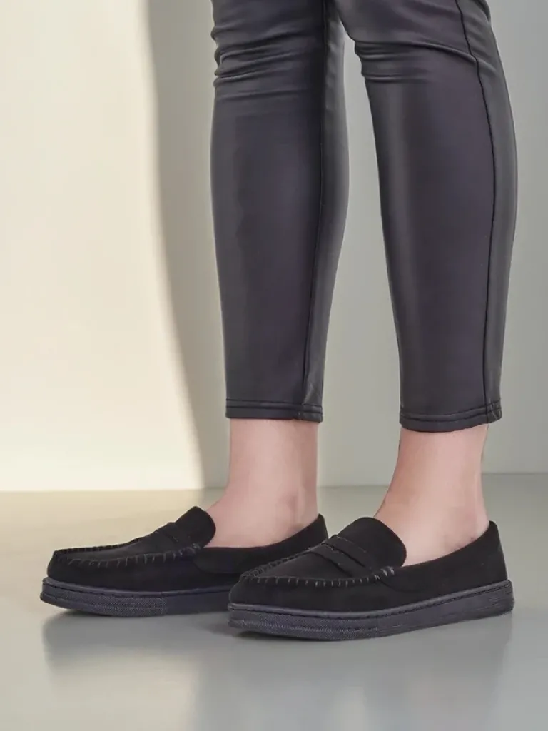 - Modne damskie mokasyny na płaskiej podeszwie. Para jest wykonana ze skóry ekologicznej zamszowej. Środek wyłożony miękką tkaniną. Idealne do casualowych outfitów!