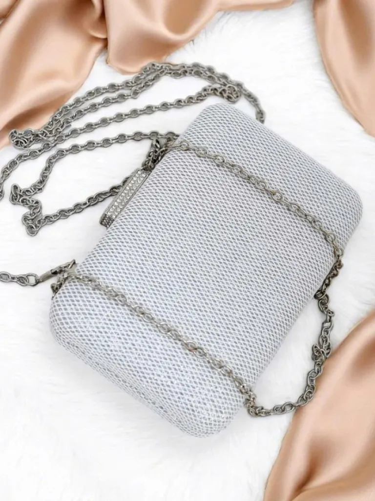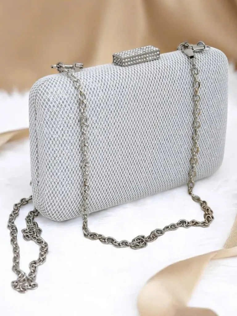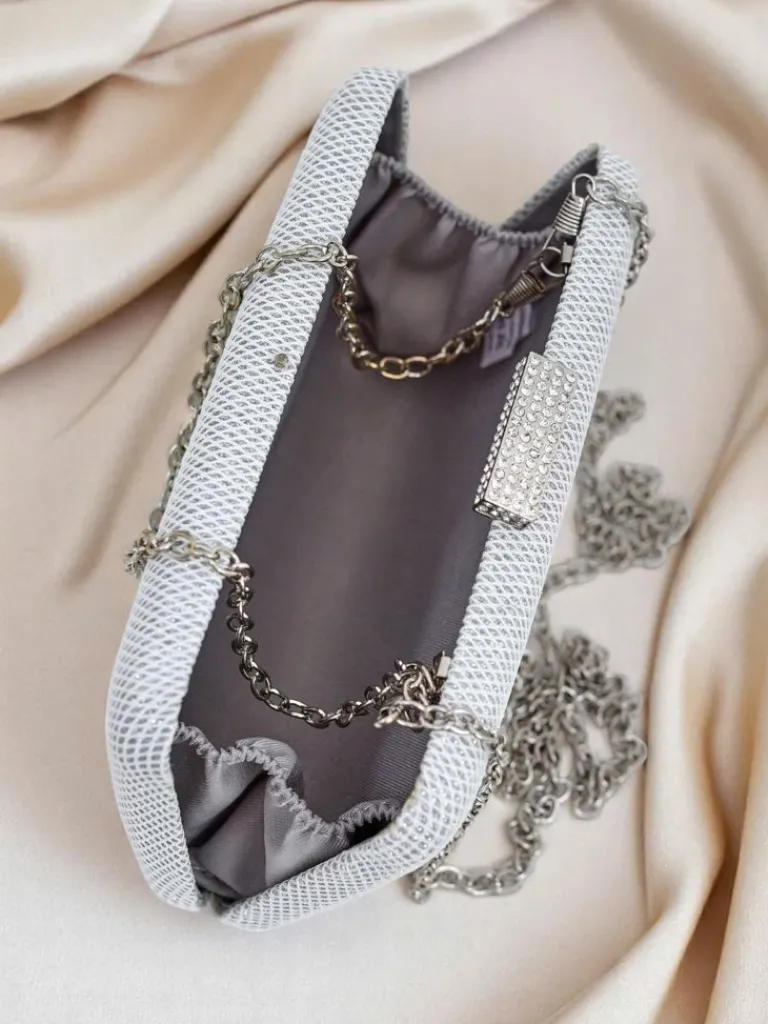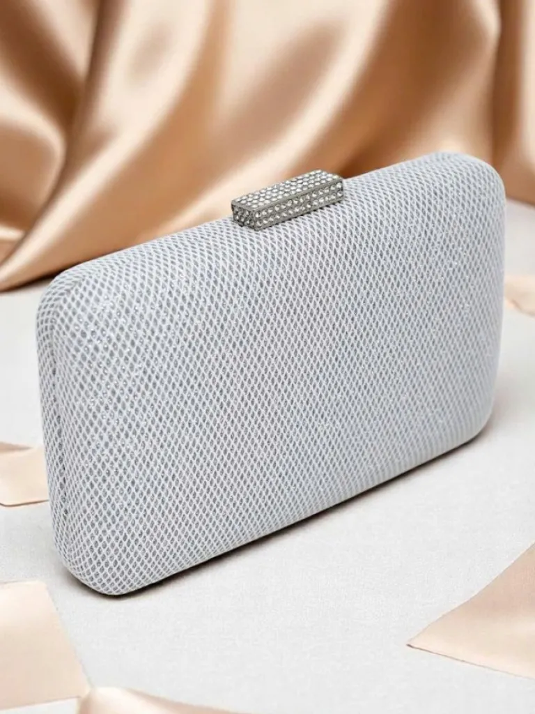 - Kopertowa torebka z eko skóry, pokryta tkaniną z połyskującą nicią i subtelnym tłoczeniem. Zapinana na zatrzask, z odpinanym łańcuszkiem — szyk i blask w jednym.