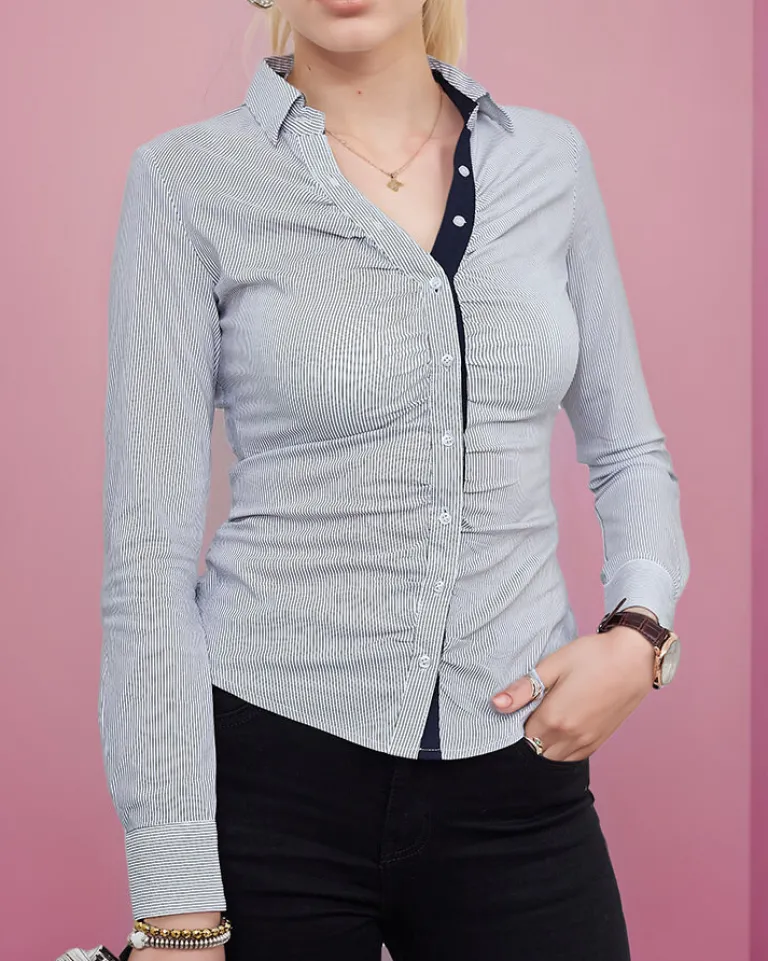- Klasyczna damska bluzka a’la koszula w paseczki, z długimi rękawami. Model z kołnierzykiem, jest zapinany na guziki. Must have w szafie każdej kobiety! UWAGA: Dokładność pomiaru (+/-) 1 cm.
