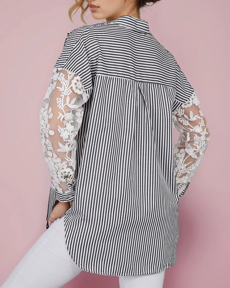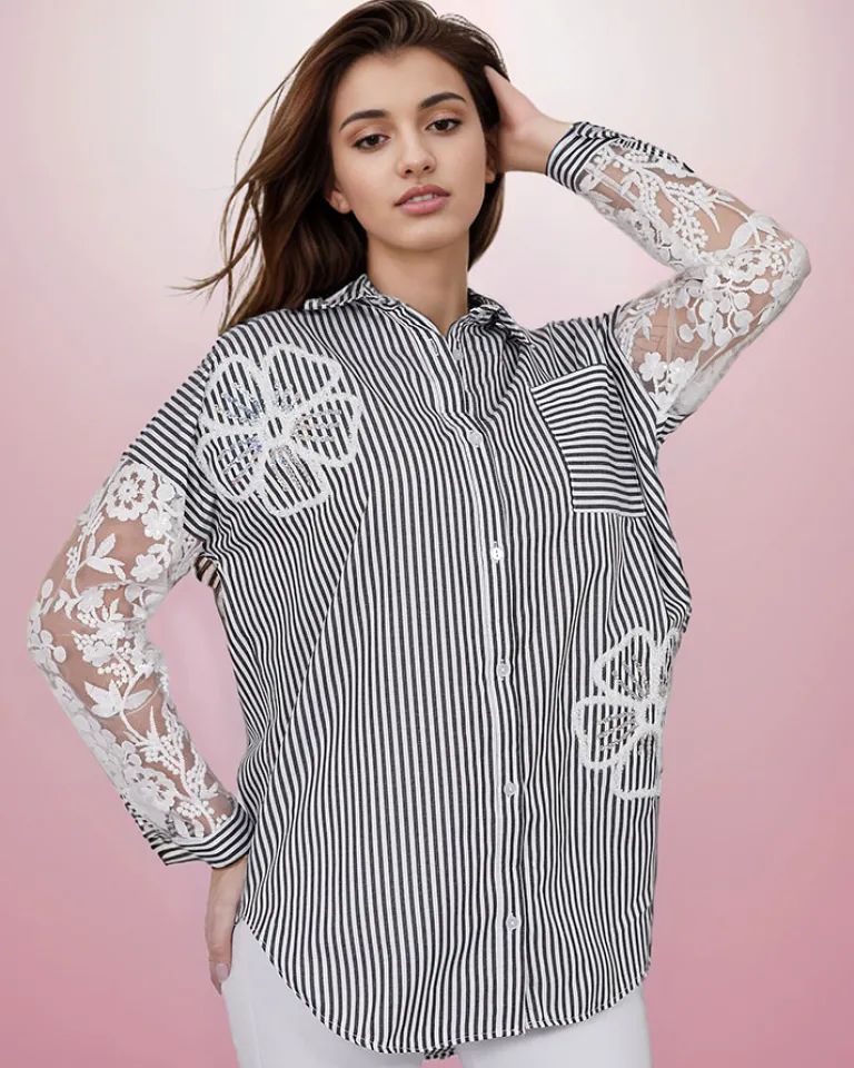 - Damska koszula z długimi, koronkowymi rękawami zdobiona wzorem w paski. Dodatkowo błyszcząca naszywka. Model jest zapinany na guziki. Must have w szafie każdej kobiety!