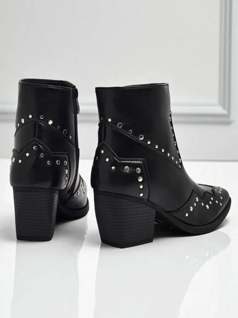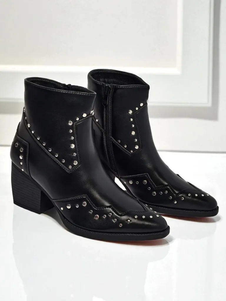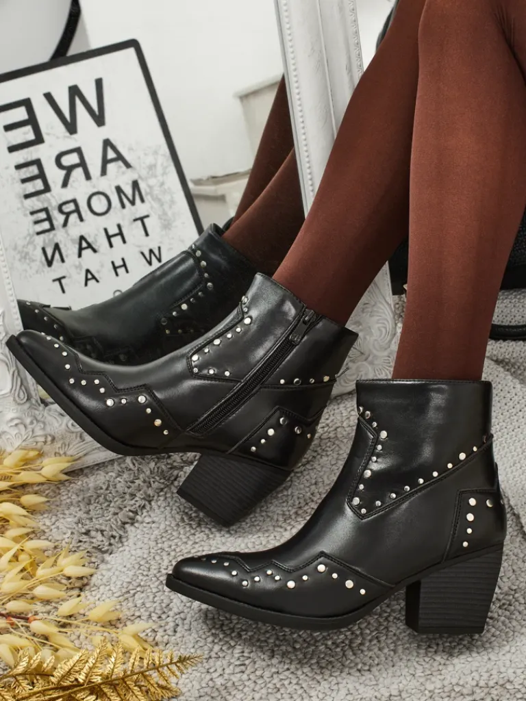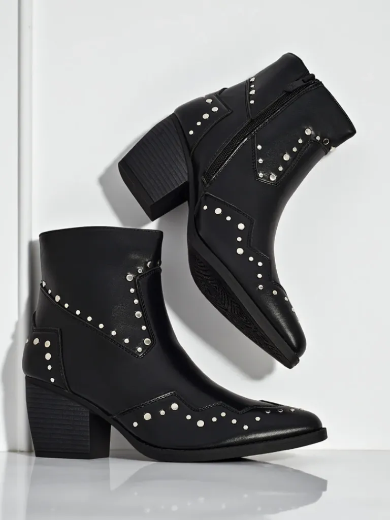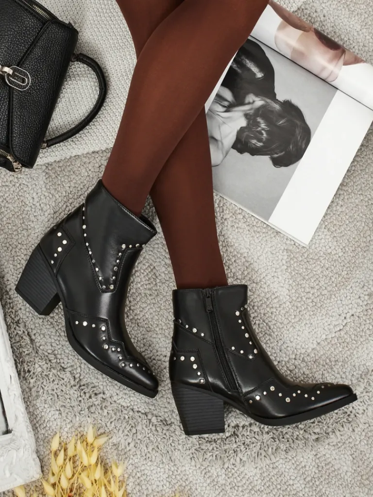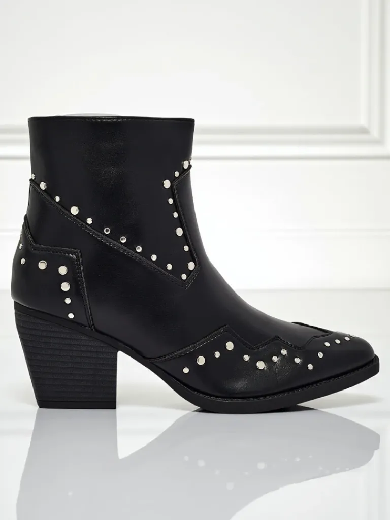 - Botki a’la kowbojki na obcasie, wykonane ze skóry ekologicznej. Wkładka eko skórzana, buty zapinane na zamek z ozdobnymi dżetami. Pasują do wielu kobiecych stylizacji!