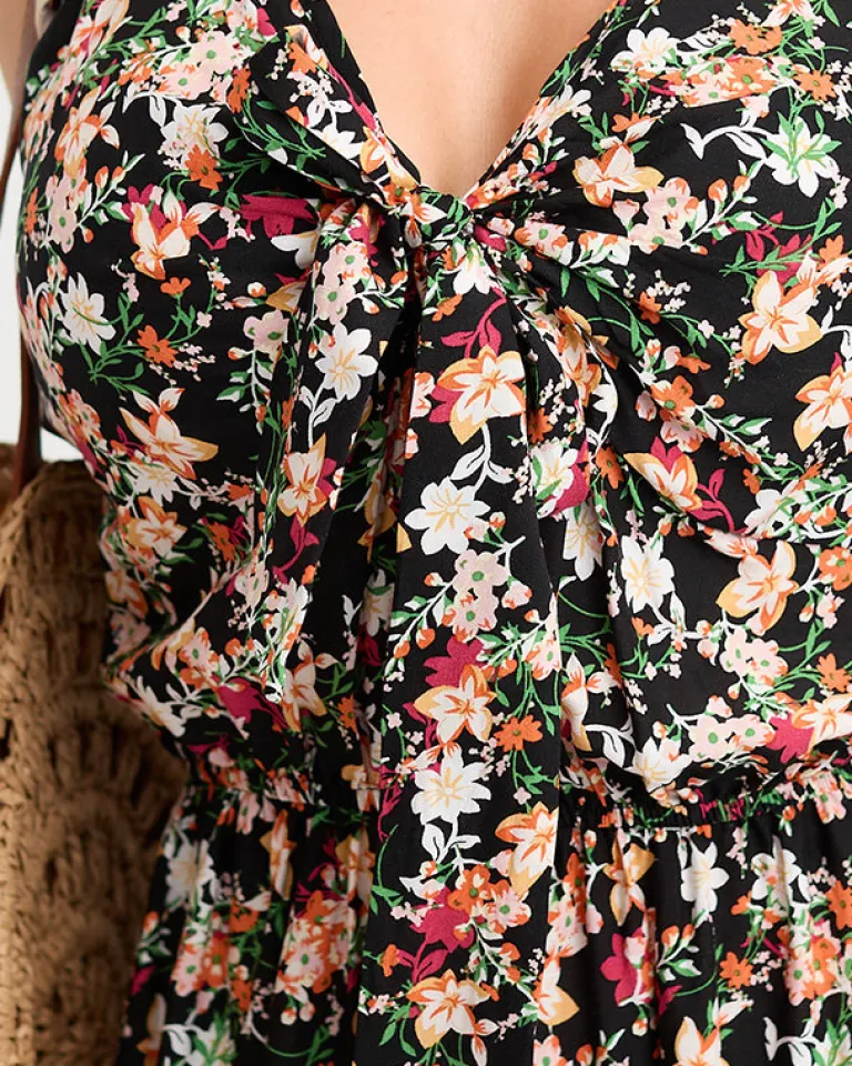 - Kwiecista damska długa sukienka wykonana z lekkiego, zwiewnego materiału. Model posiada dekolt w serek, regulowane ramiączka oraz ozdobną kokardę na przodzie. Świetna na letnie upały! UWAGA: Dokładność pomiaru (+/-) 1 cm.