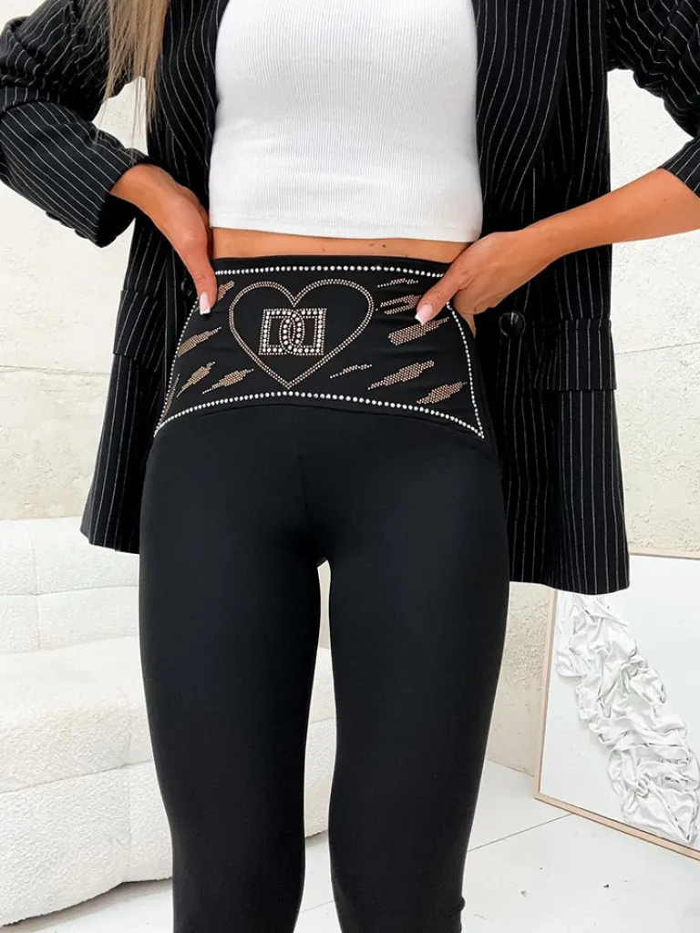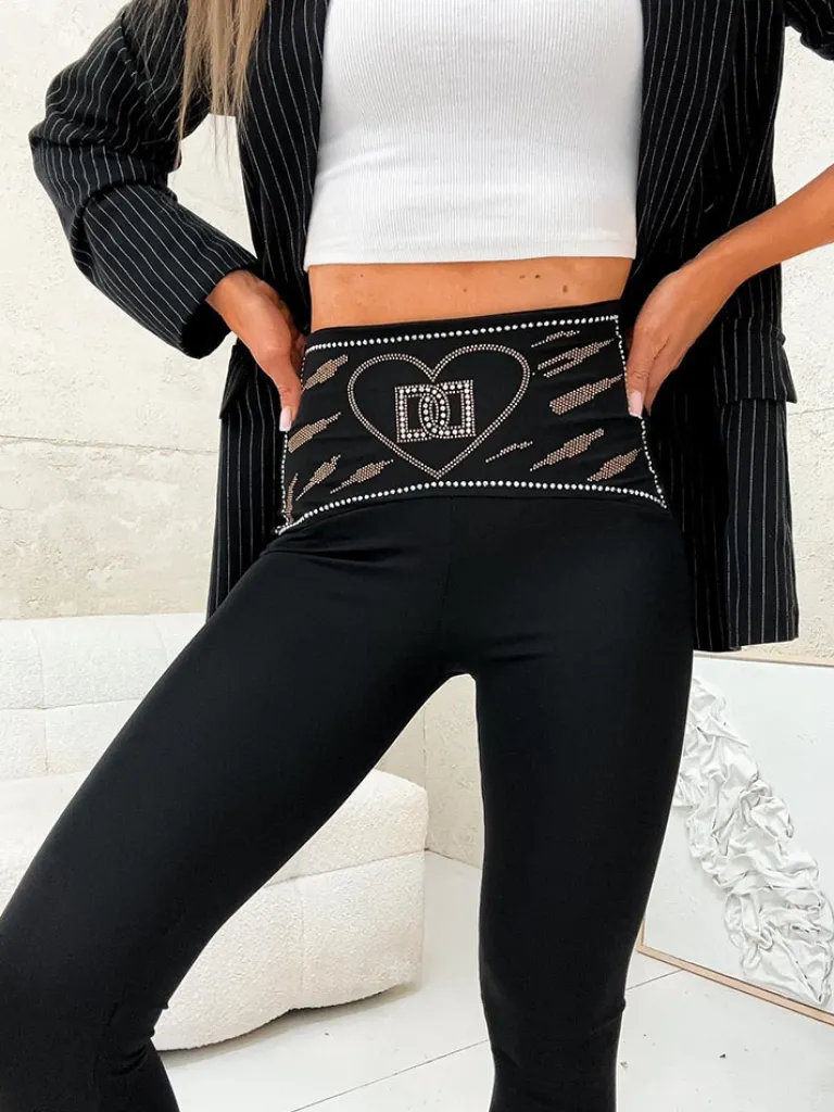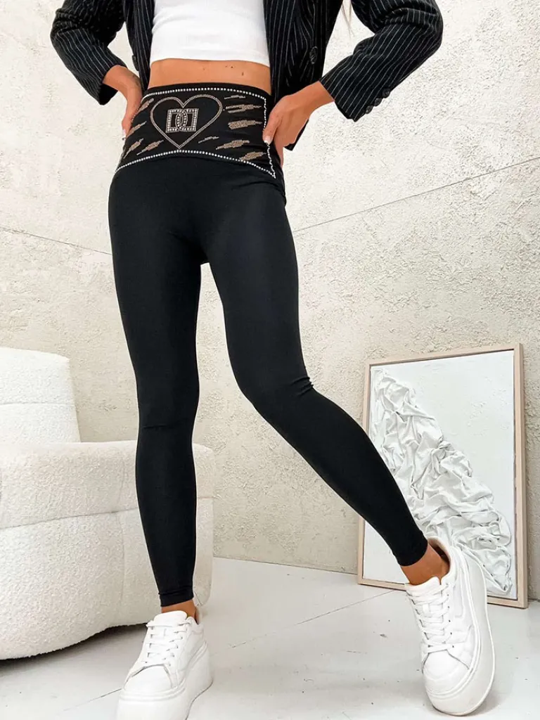 - Stylowe legginsy wykonane z elastycznej tkaniny. Szeroka guma w pasie zdobiona cyrkoniami zapewnia komfort noszenia. Idealne na aktywny dzień!