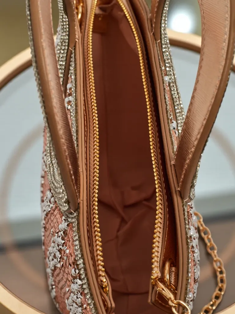- Olśniewająca mała torebka damska z cyrkoniami. Zapinana na zamek, z rączkami i odpinanym łańcuszkiem. Idealna na wieczorne wyjścia — mała, zjawiskowa i pełna blasku!