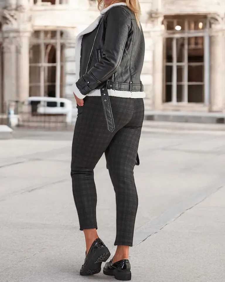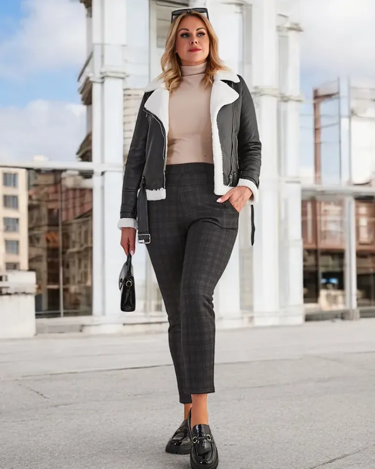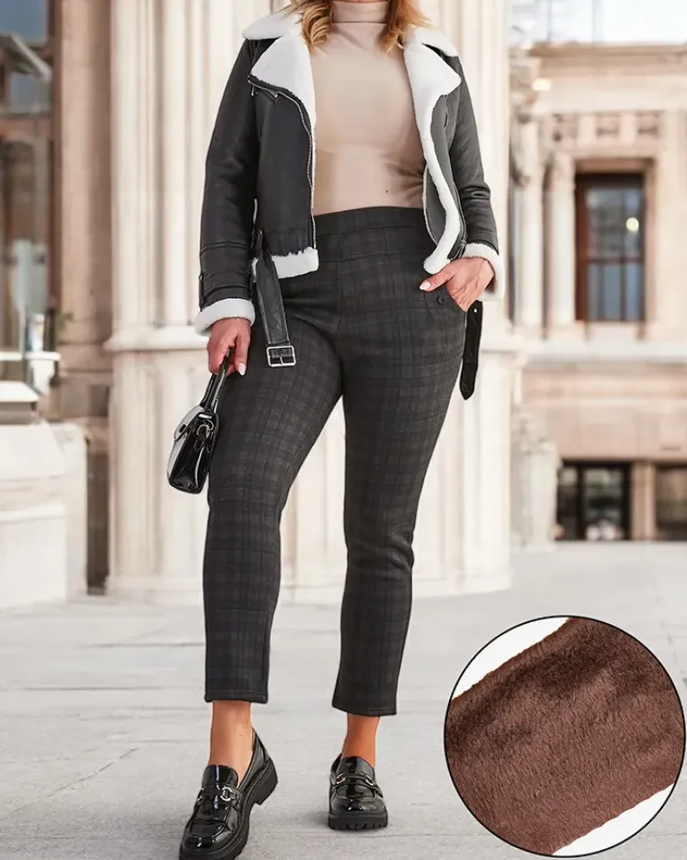 - Damskie spodnie typu tregginsy, wykonane z rozciągliwego materiału. Model posiada szeroką gumę w pasie oraz 2 wsuwane kieszenie. Produkt jest ocieplany grubym futerkiem i zdobiony wzorem w kratę. Hit tego sezonu!