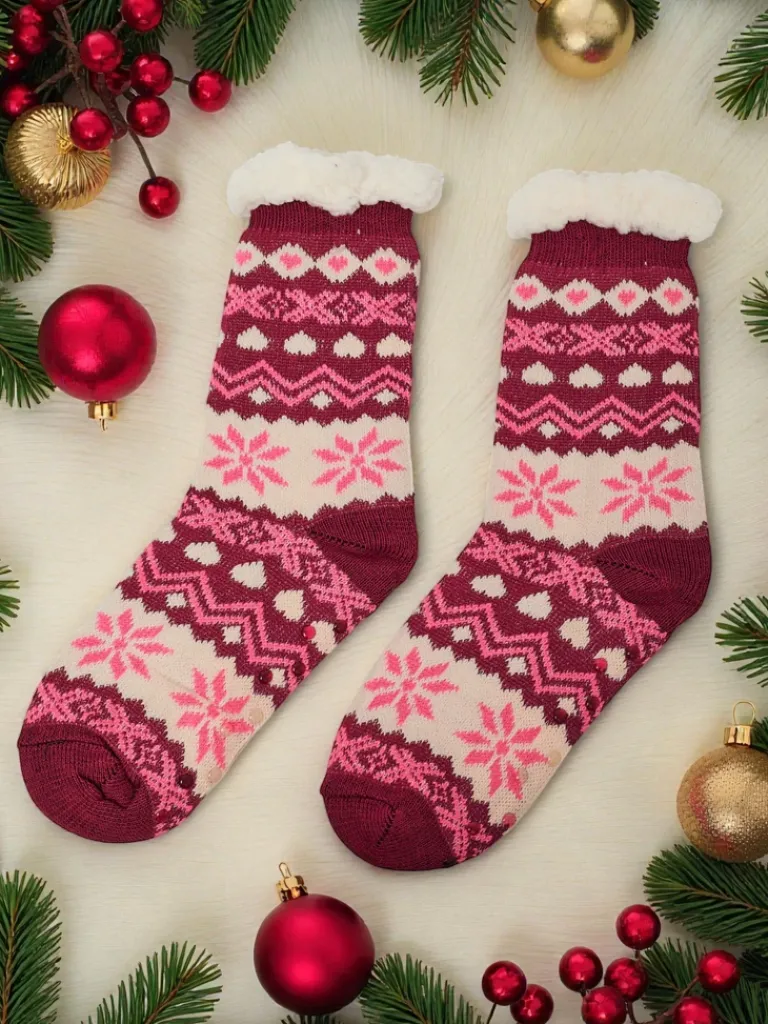 - Przepiękne damskie grube skarpety wykończone świątecznym printem. W środku ocieplane białym, cieplutkim kożuszkiem. Skarpetki świetnie się sprawdzą na chłodniejsze, zimowe wieczory!