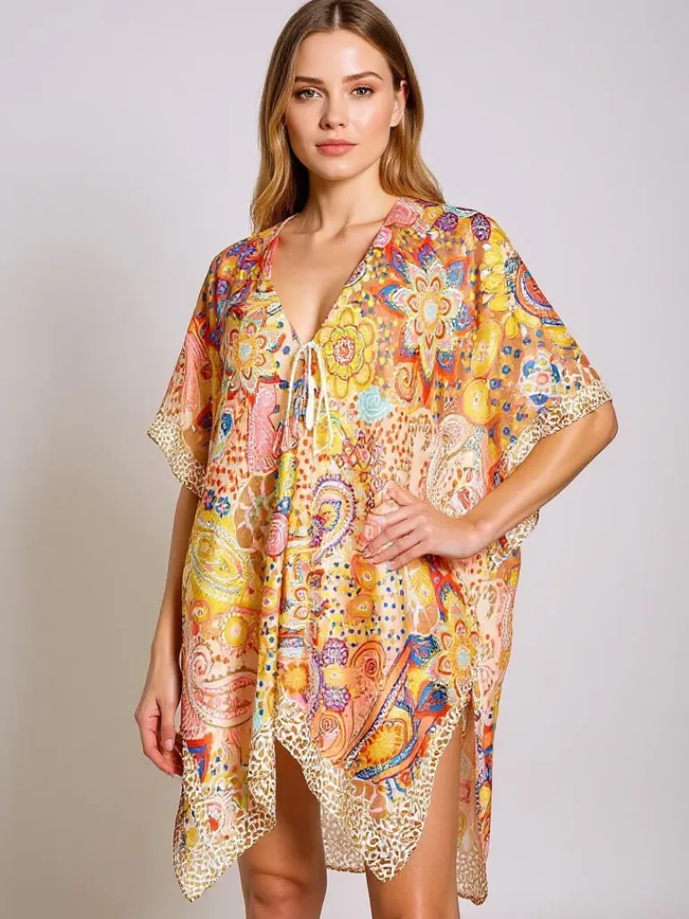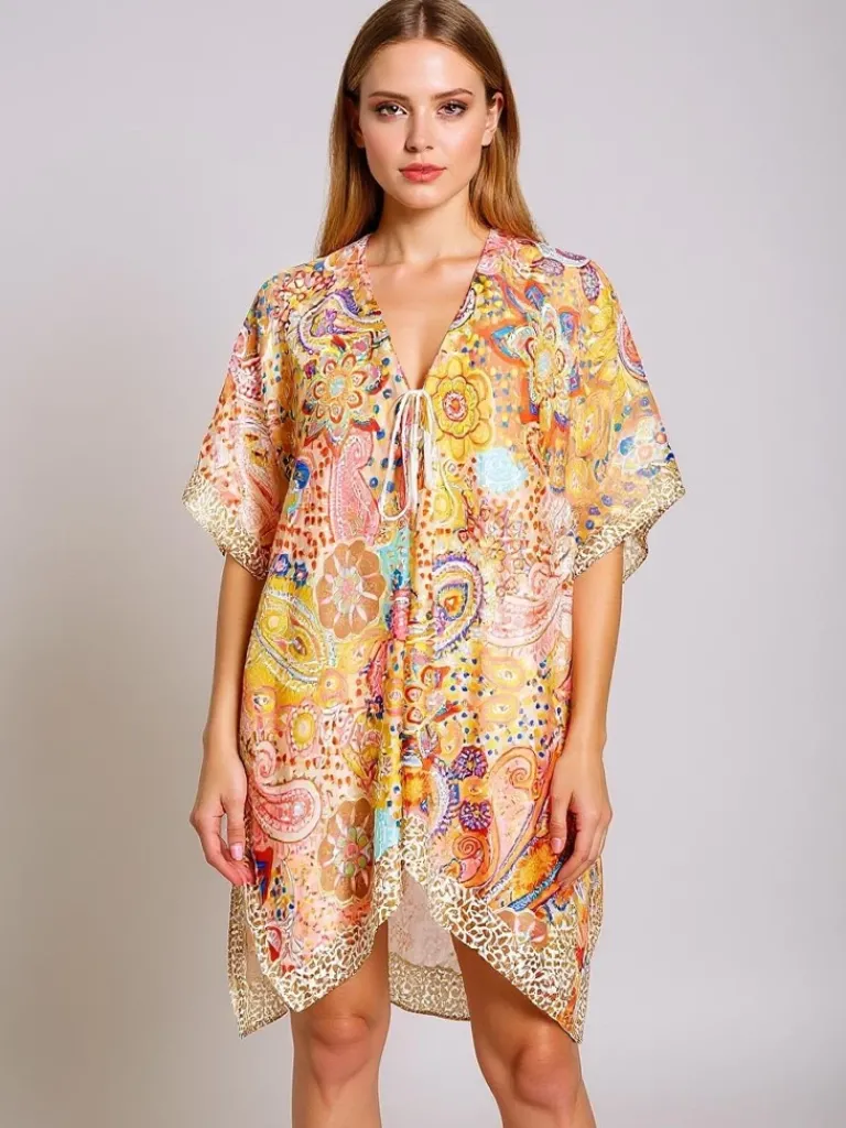 - Letnia tunika plażowa typu pareo z dekoltem w serek i asymetrycznym dołem to stylowy must-have na wakacje. Zwiewna, lekka tkanina i efektowny wzór podkreślają kobiecość, a luźny krój zapewnia komfort w upalne dni. Idealna na plażę i letnie spacery.