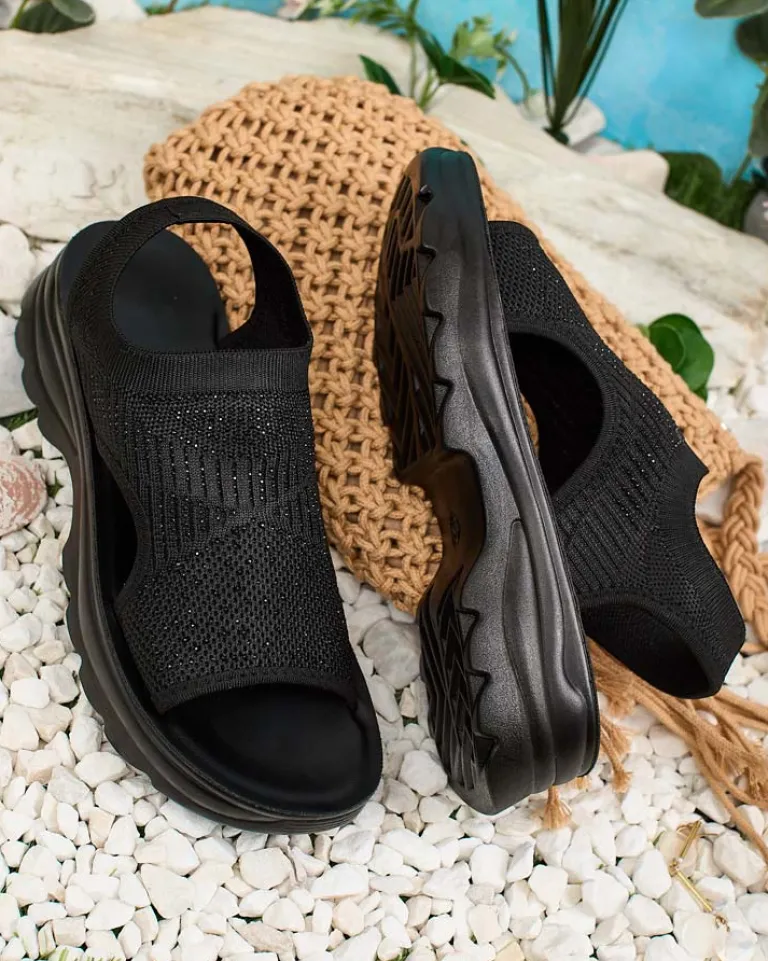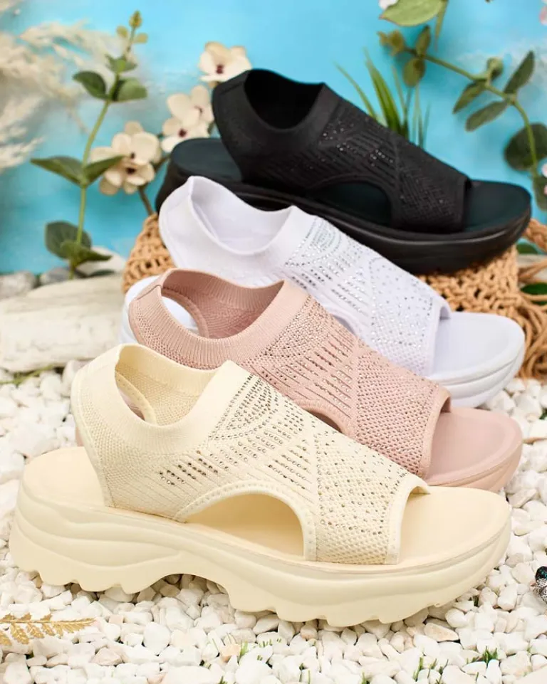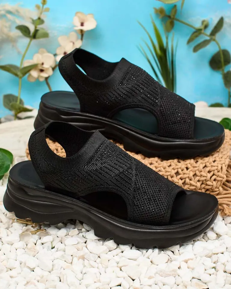 - Wyjątkowe sandałki z cholewką z cyrkoniami, na płaskiej podeszwie wykonane z elastycznej tkaniny i gumowej wkładki. Model wsuwany. Połączenie stylu i wygody!