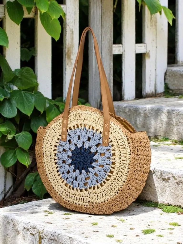 - Duża, półokrągła torebka słomiana z plecionki, ozdobiona kwiatowym wzorem. 1 komora, kieszonka, zamek. Idealna na lato, plażę i stylowe wyjścia!