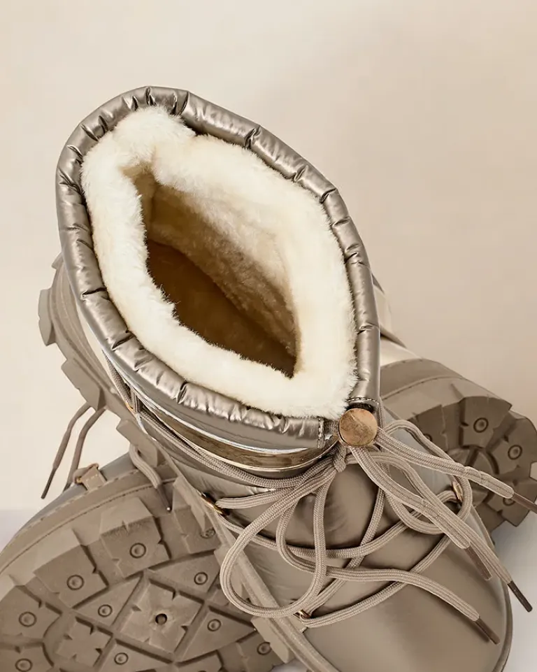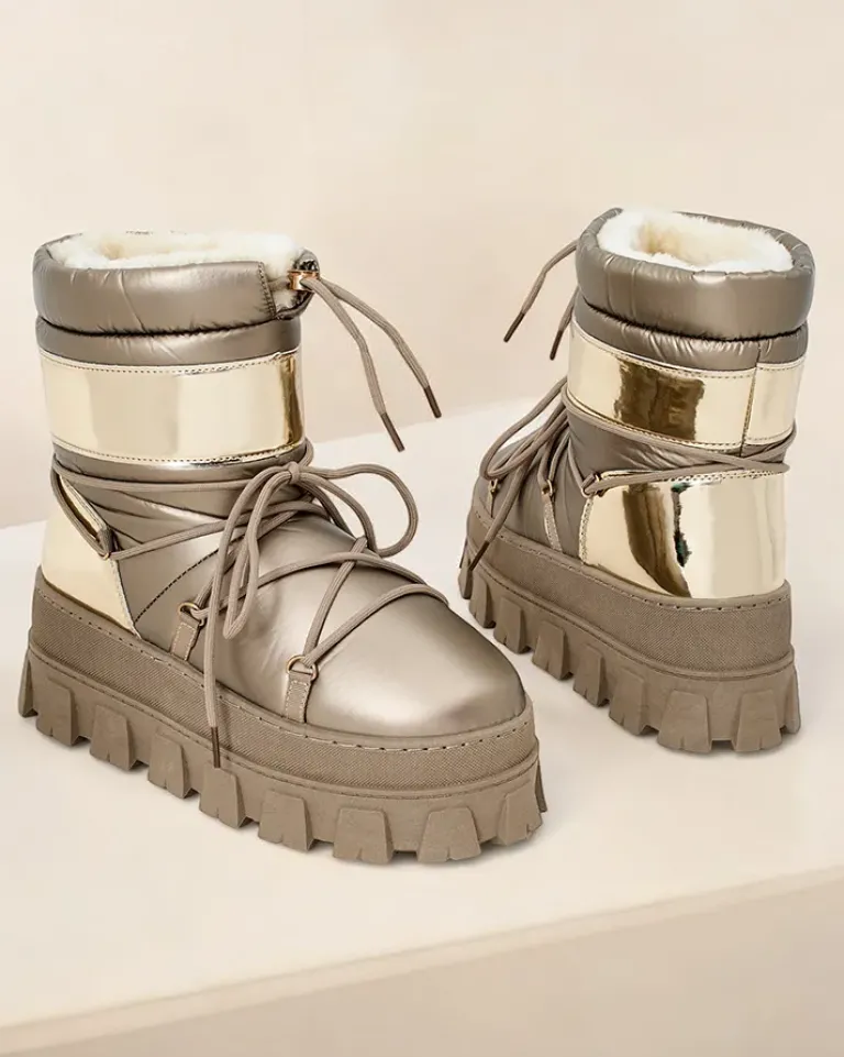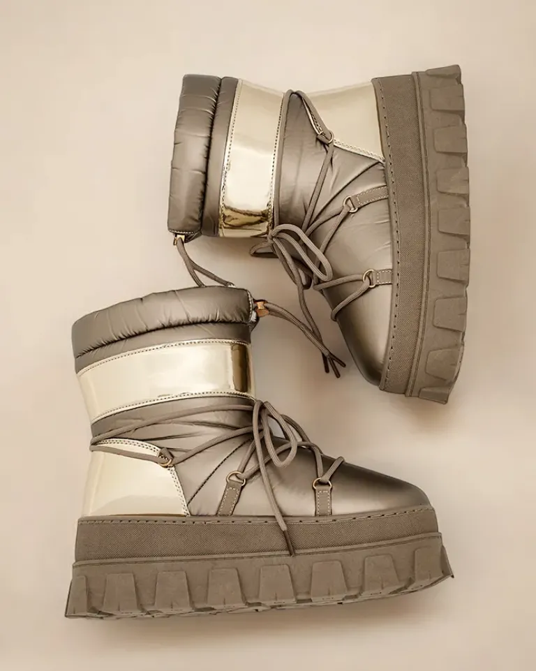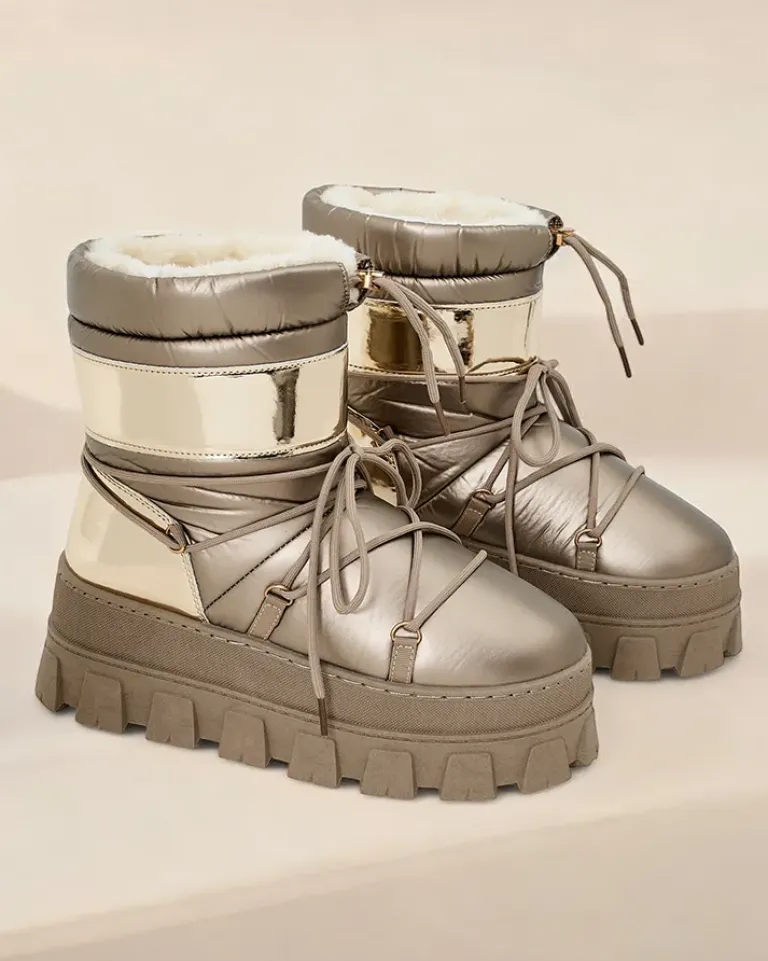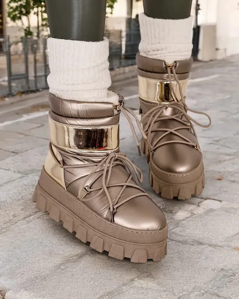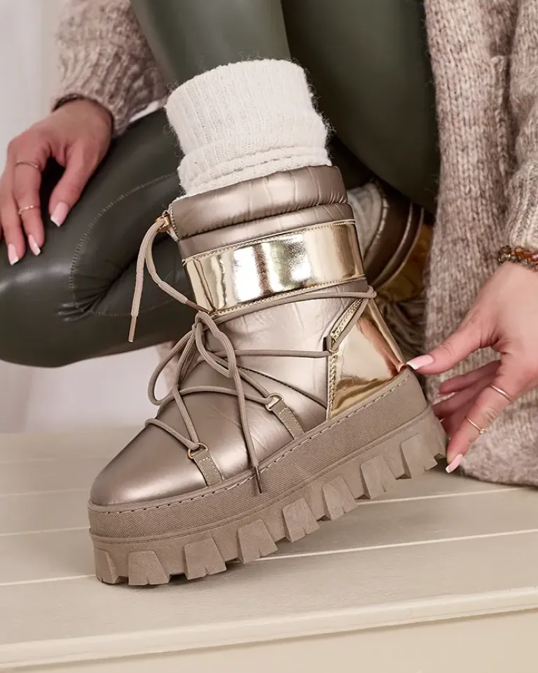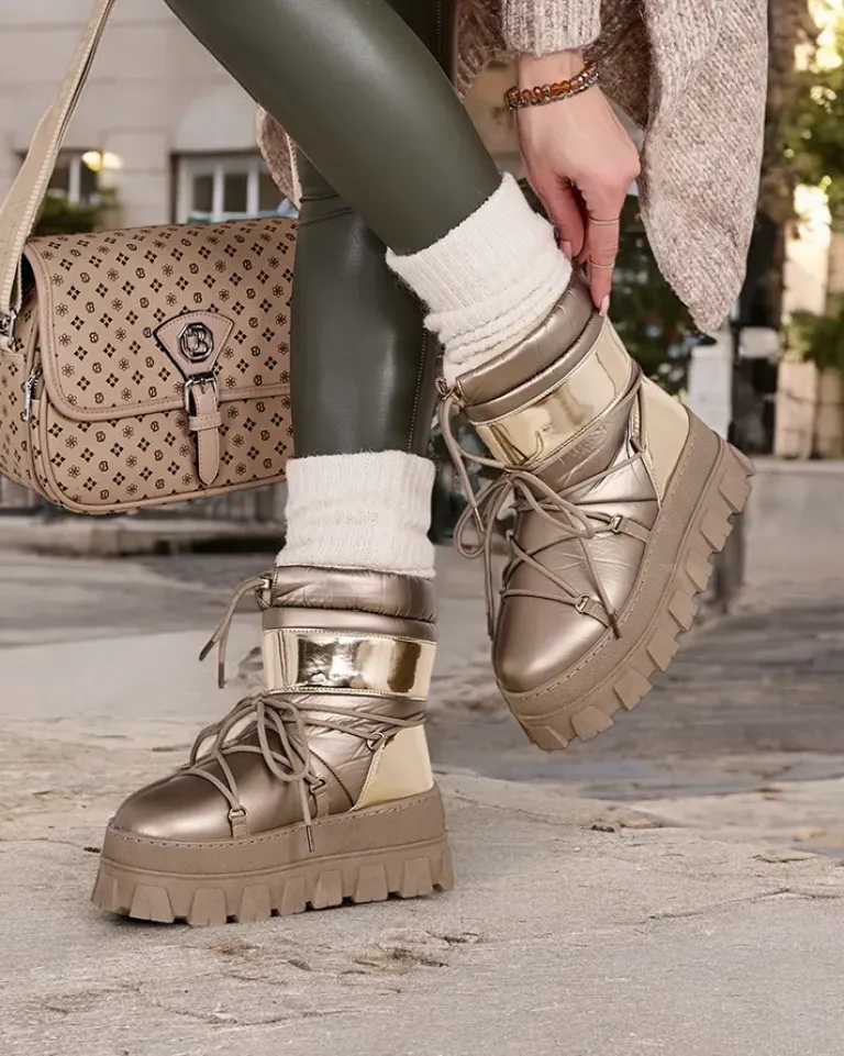 - Damskie obuwie typu śniegowce z cholewką wykonaną z połączenia takniny a’la cerata oraz eko skóry lakierowanej. W środku przyjemne futerko, obuwie wsuwane i sznurowane. Idealne na zimę!
