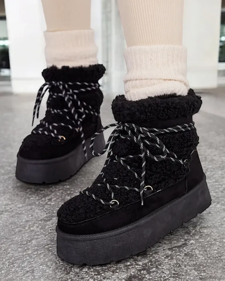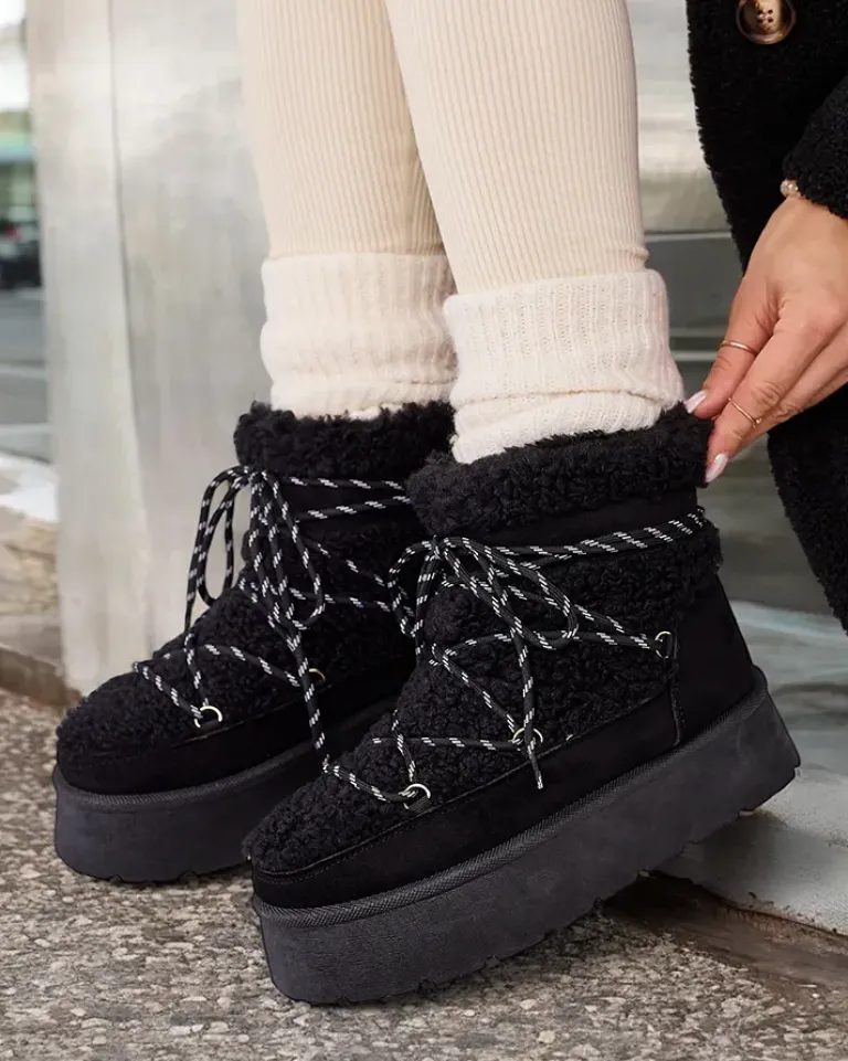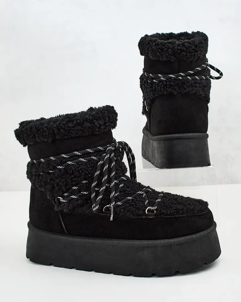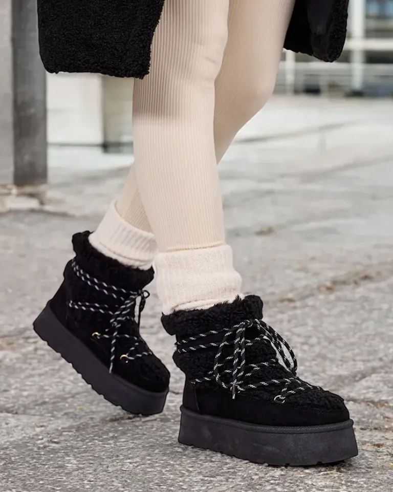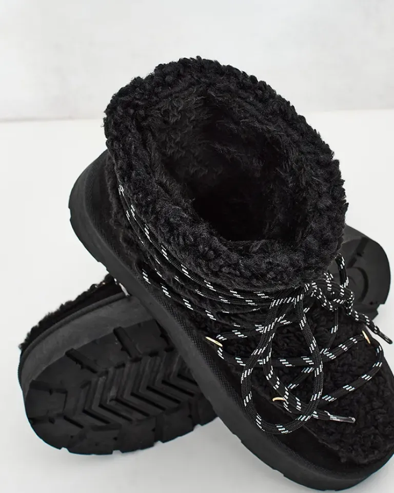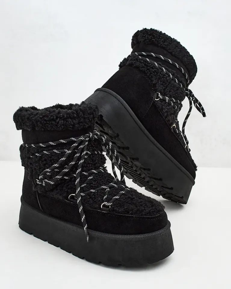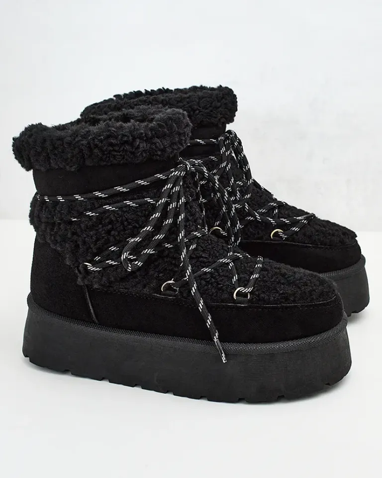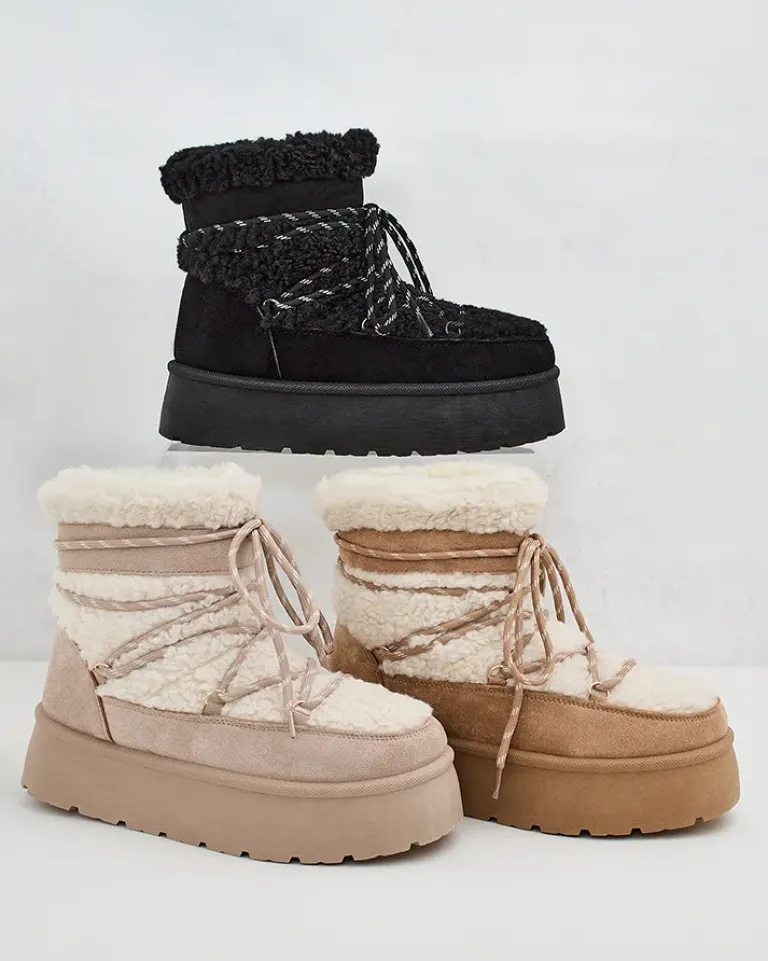 - Damskie obuwie typu śniegowce z cholewką wykonaną z połączenia eko skóry zamszowej oraz materiału a’ la kożuszek. W środku wyłożone futerkiem, obuwie wsuwane i sznurowane. Idealne na zimę!
