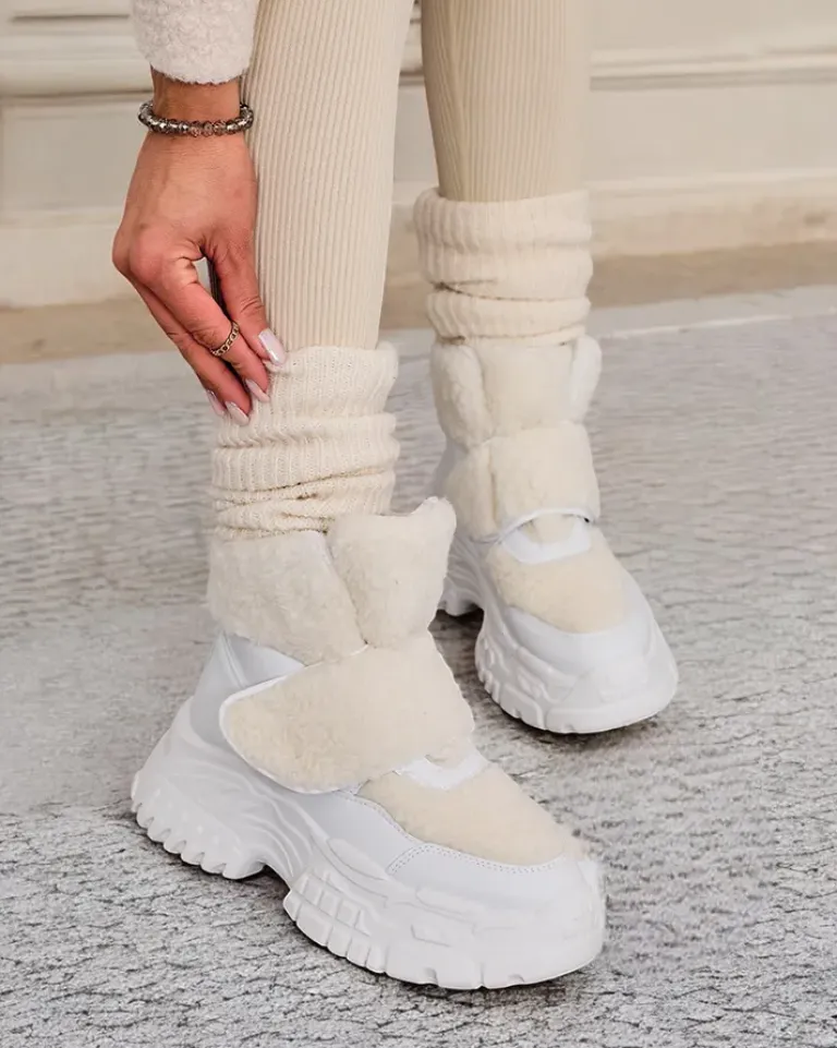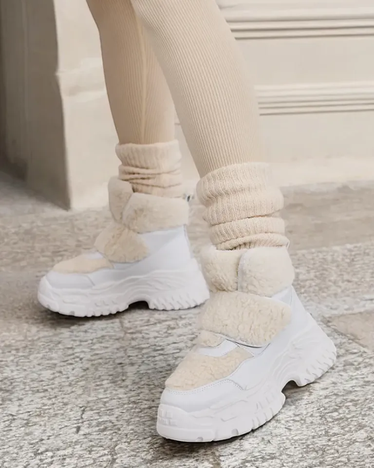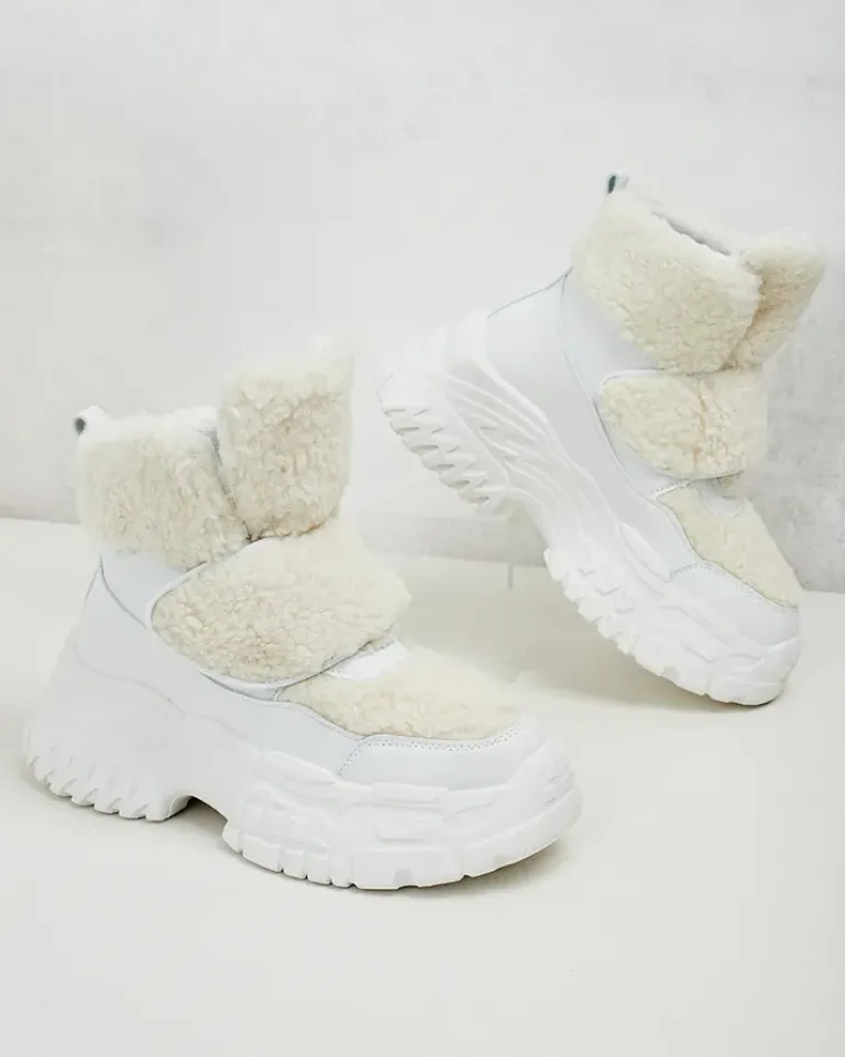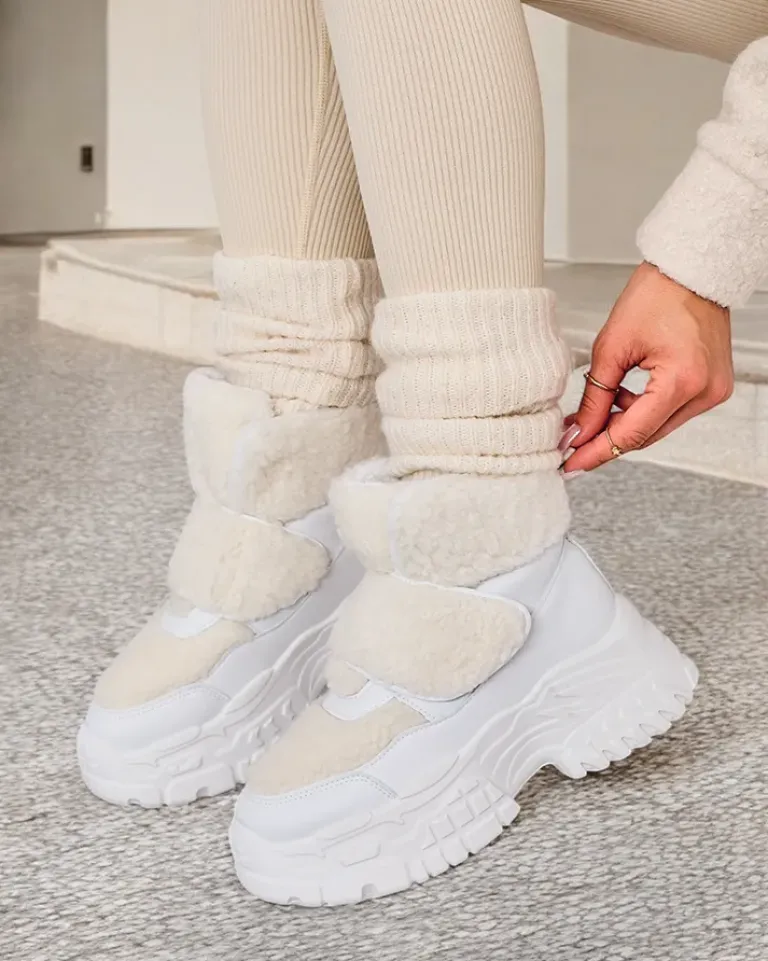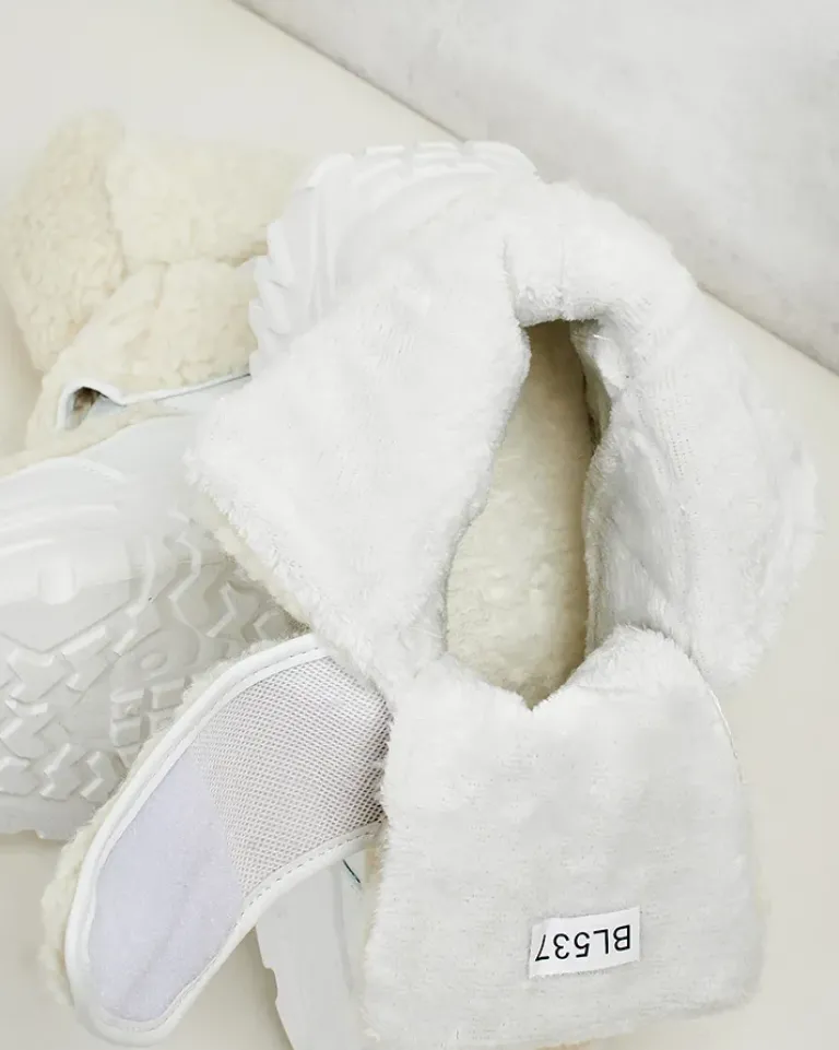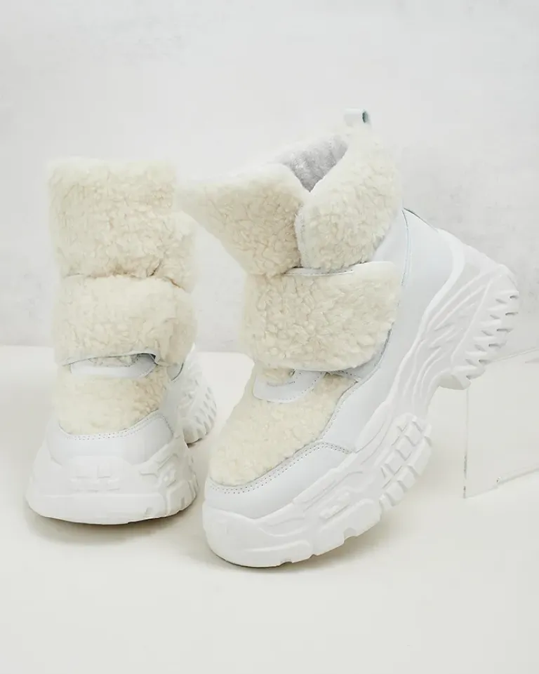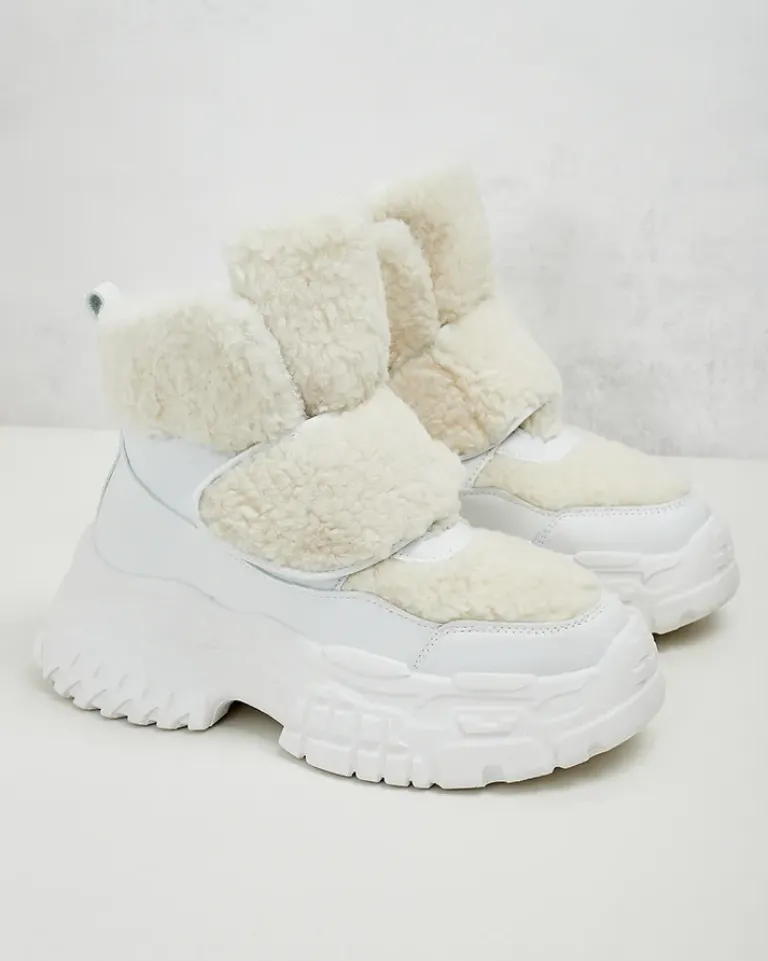 - Ponadczasowe damskie obuwie typu śniegowce. Cholewka wykonana ze skóry ekologicznej ze wstawkami a’la kożuszek. W środku ocieplenie w formie futerka, obuwie posiada zapięcie na rzep. Idealne na chłodniejszą porę roku!