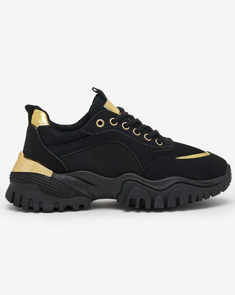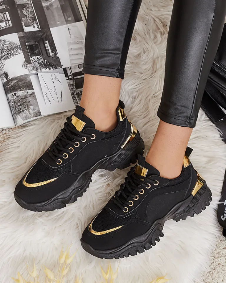 - Sportowe sneakersy damskie wykonane z eko-skóry. W środku tkaninowa wkładka. Model jest sznurowany, na masywnej podeszwie ze srebrną wstawką z tyłu. Będą świetną ozdobą do codziennych stylizacji.