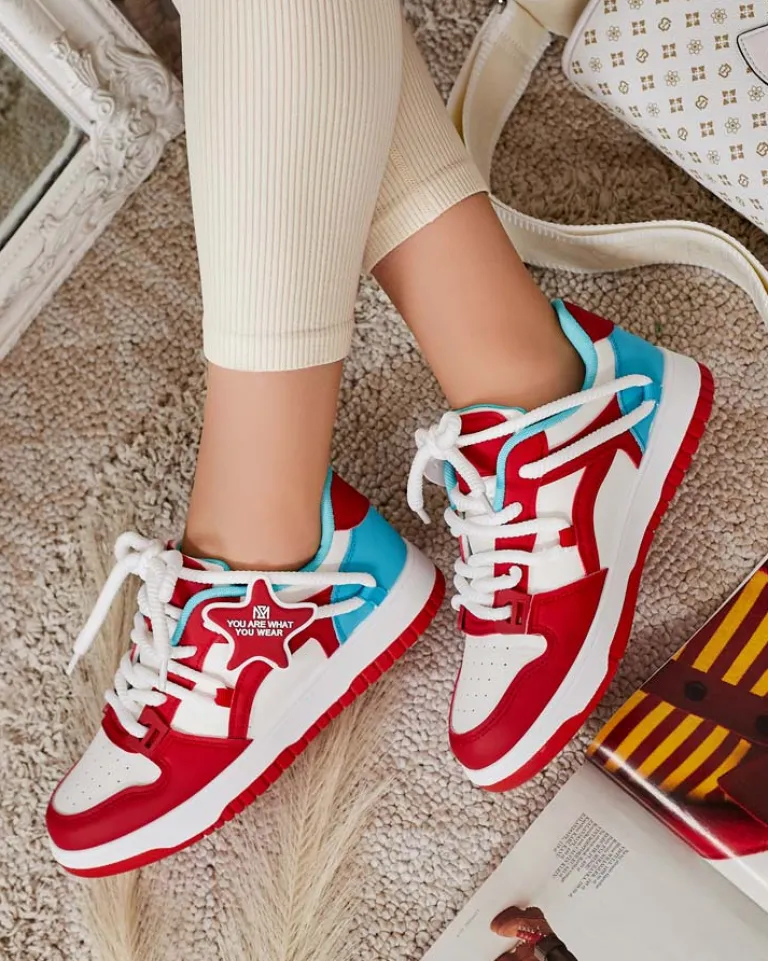 - Sneakersy damskie na płaskiej podeszwie – perfekcyjne połączenie stylu i komfortu. Obuwie wykonane z eko skóry. Model sznurowany z ozdobną gwiazdą, posiada skórzaną wkładkę. Idealne dla aktywnych osób!