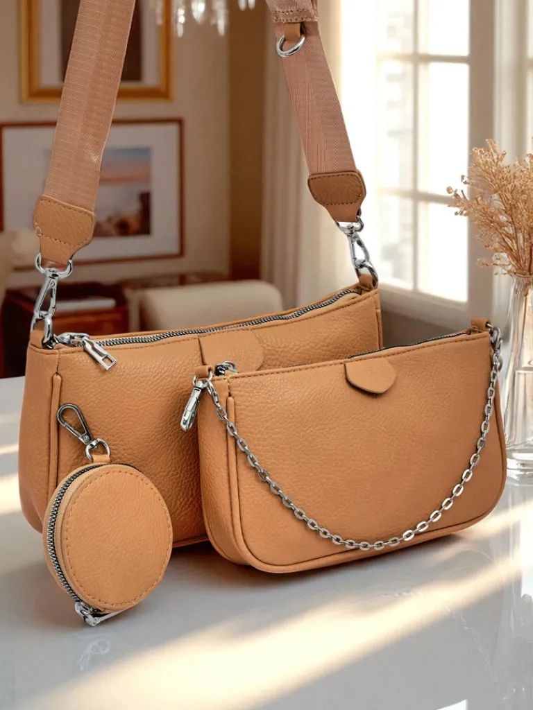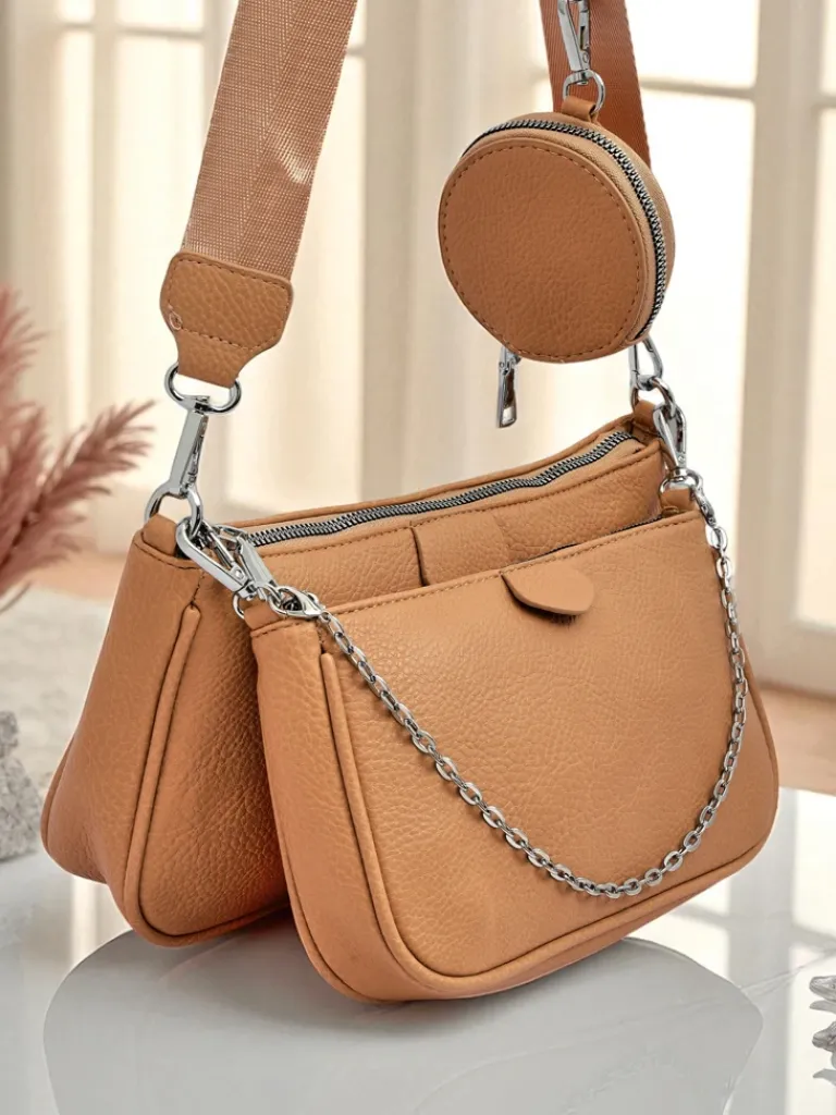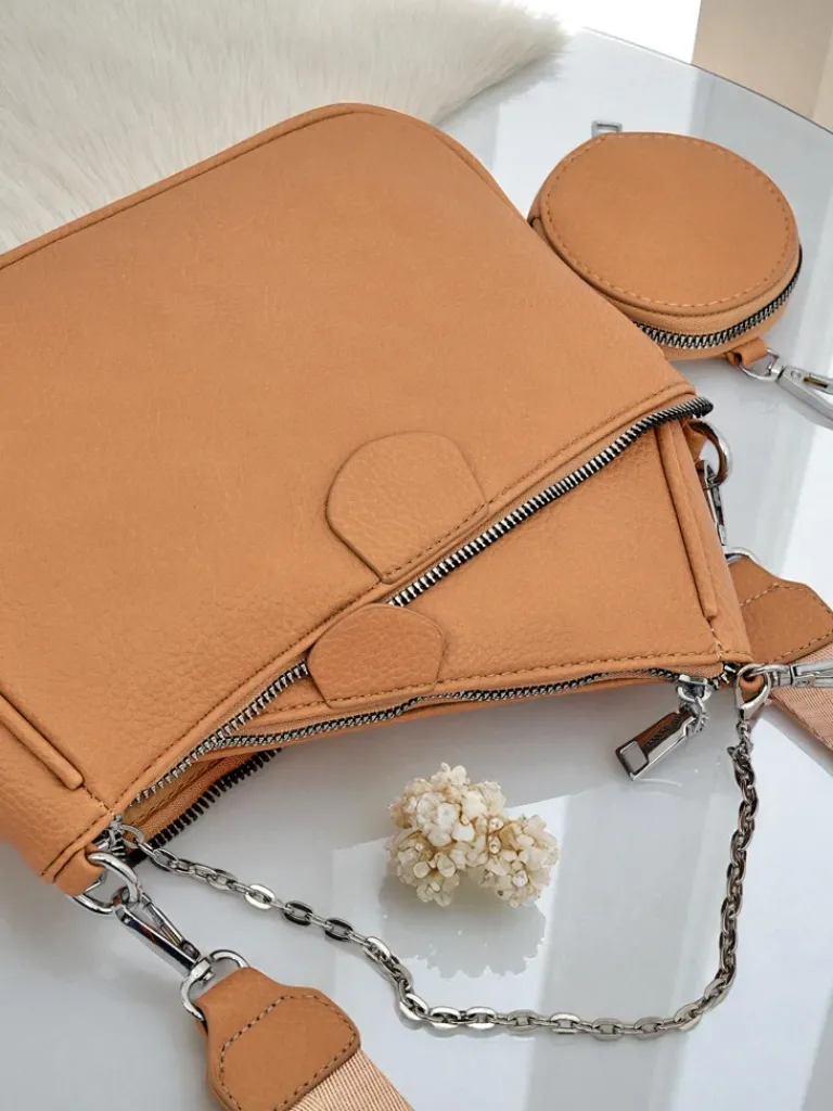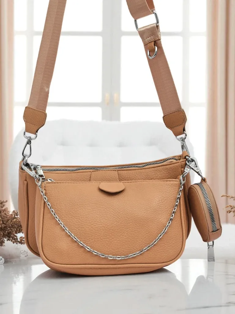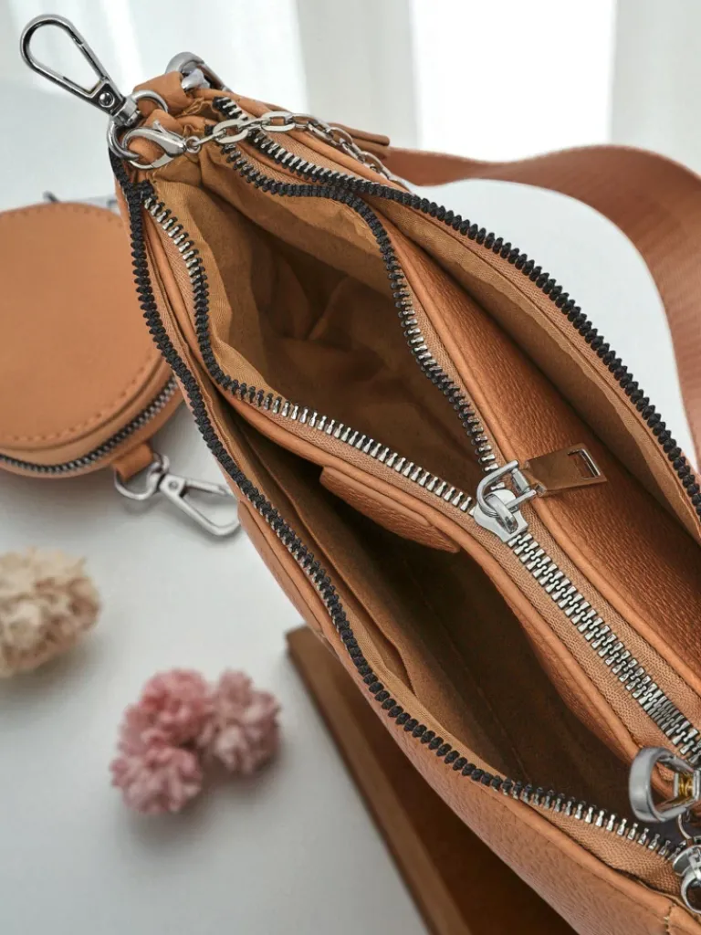 - Stylowa, mała torebka z eko skóry z podwójną komorą na zamek. W zestawie odpinany, regulowany pasek, dopasowana kosmetyczka i portmonetka – idealna na co dzień i specjalne okazje.