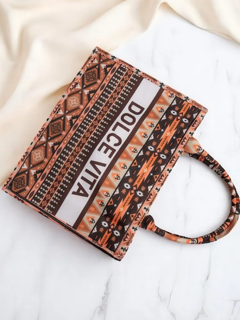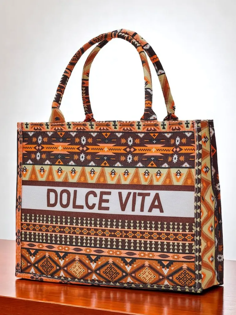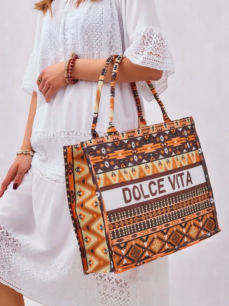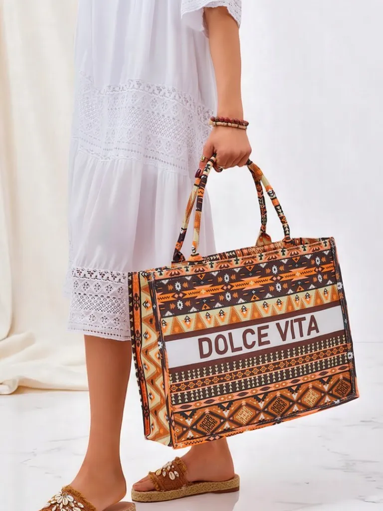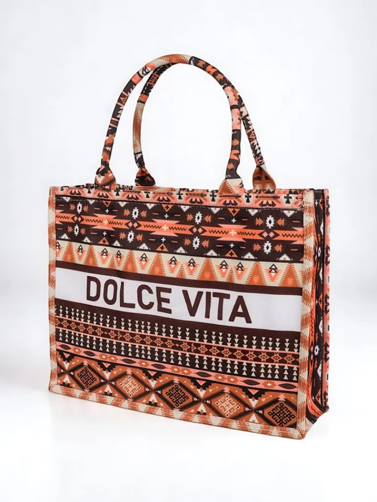 - Duża, materiałowa torebka damska z kolorowym, wzorzystym motywem i napisem DOLCE VITA. 1 komora, lekka i pojemna – idealna na lato i stylowe wyjścia!