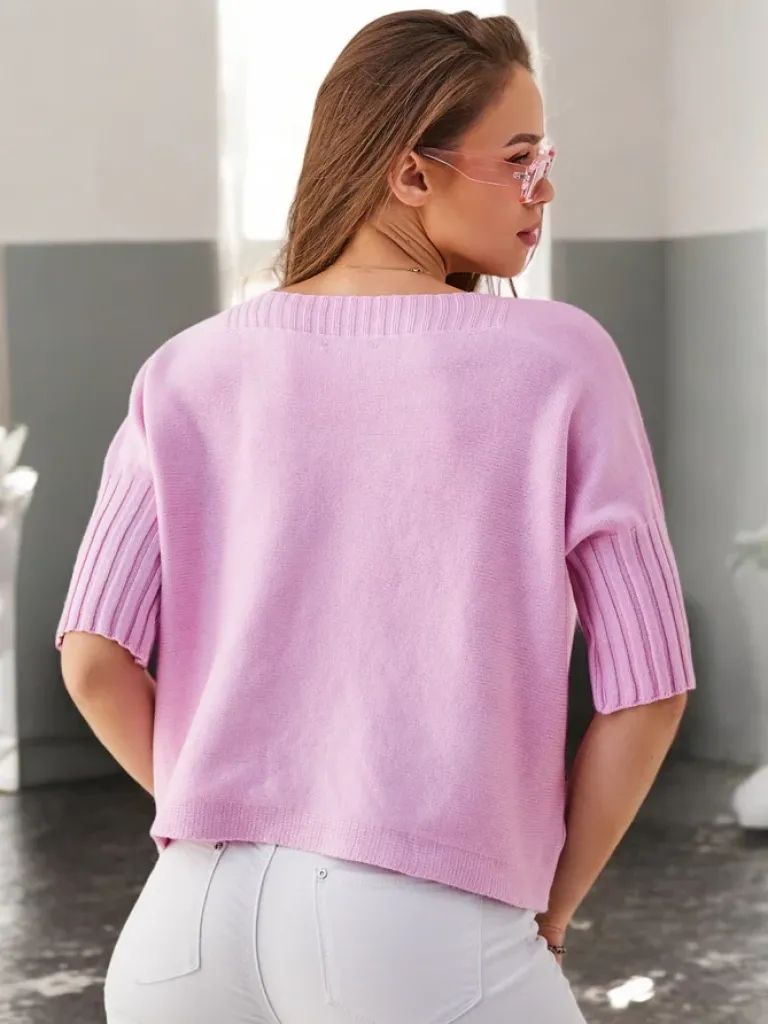- Ten uroczy sweter damski to idealna propozycja na chłodniejsze dni. Z krótkimi rękawami i okrągłym dekoltem zapewnia komfort i poczucie stylu!