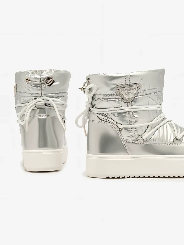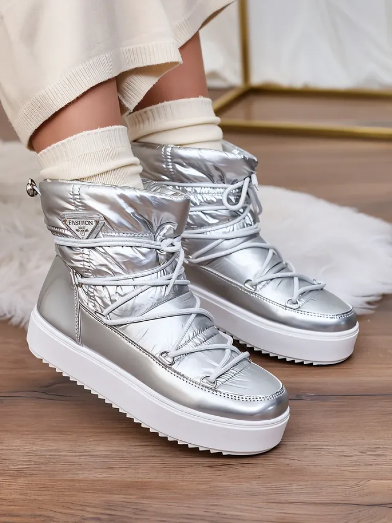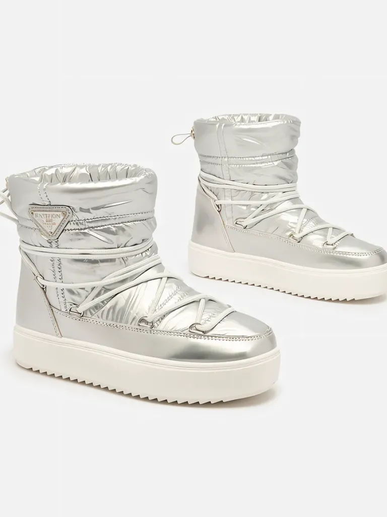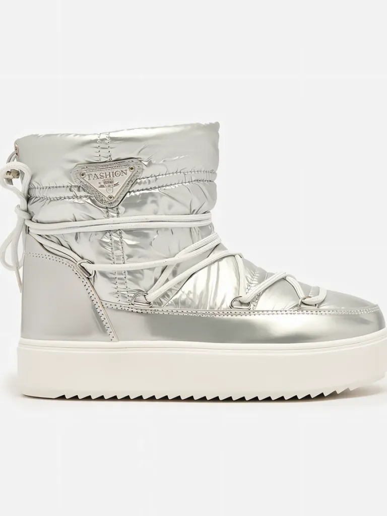 - Damskie obuwie typu śniegowce z cholewką wykonaną z połączenia eko skóry lakierowanej oraz materiału a’la cerata. W środku ocieplenie w formie futerka, obuwie wsuwane. Model posiada ściągacz na końcu cholewki. Idealne na zimę!