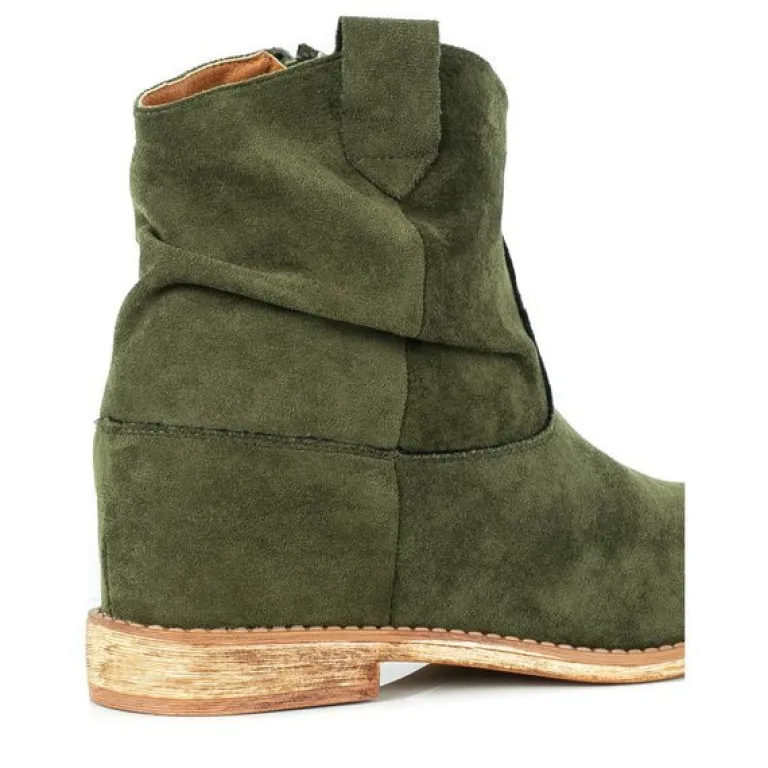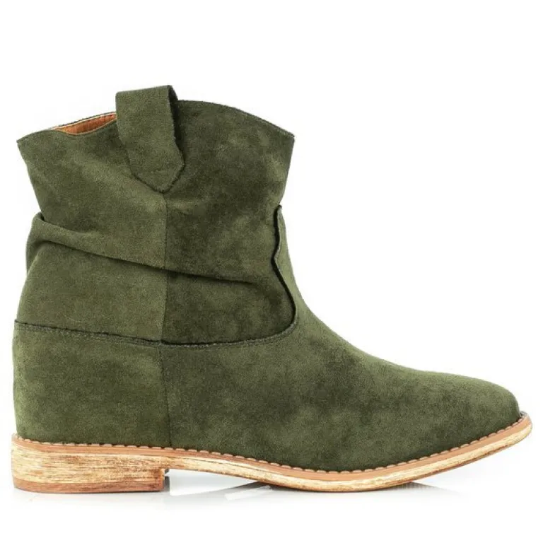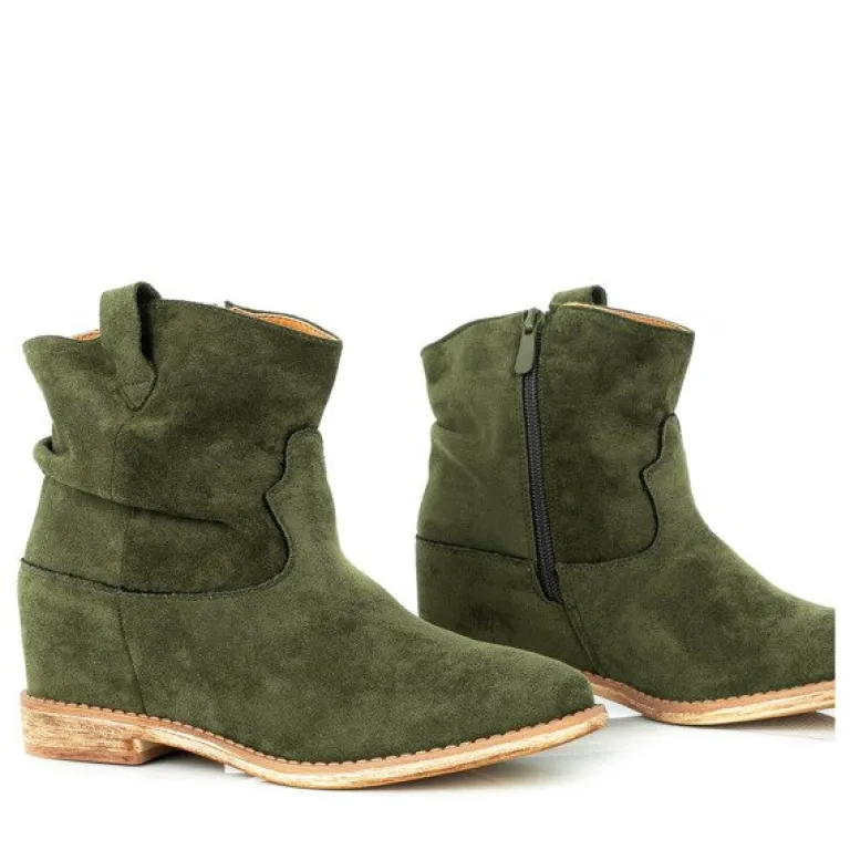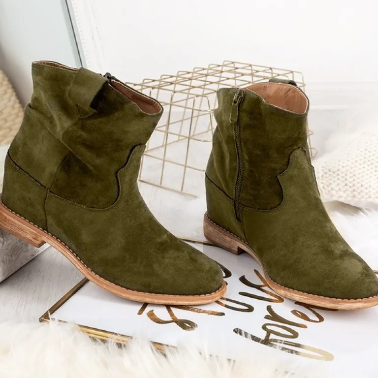 - Zielone botki a’la kowbojki wykonane ze skóry ekologicznej zamszowej. Model posiada ocieplenie w środku w formie miękkiego futerka. Obuwie na niskim krytym koturnie. Buty zapinane suwakiem. Idealne na chłodniejsze dni.