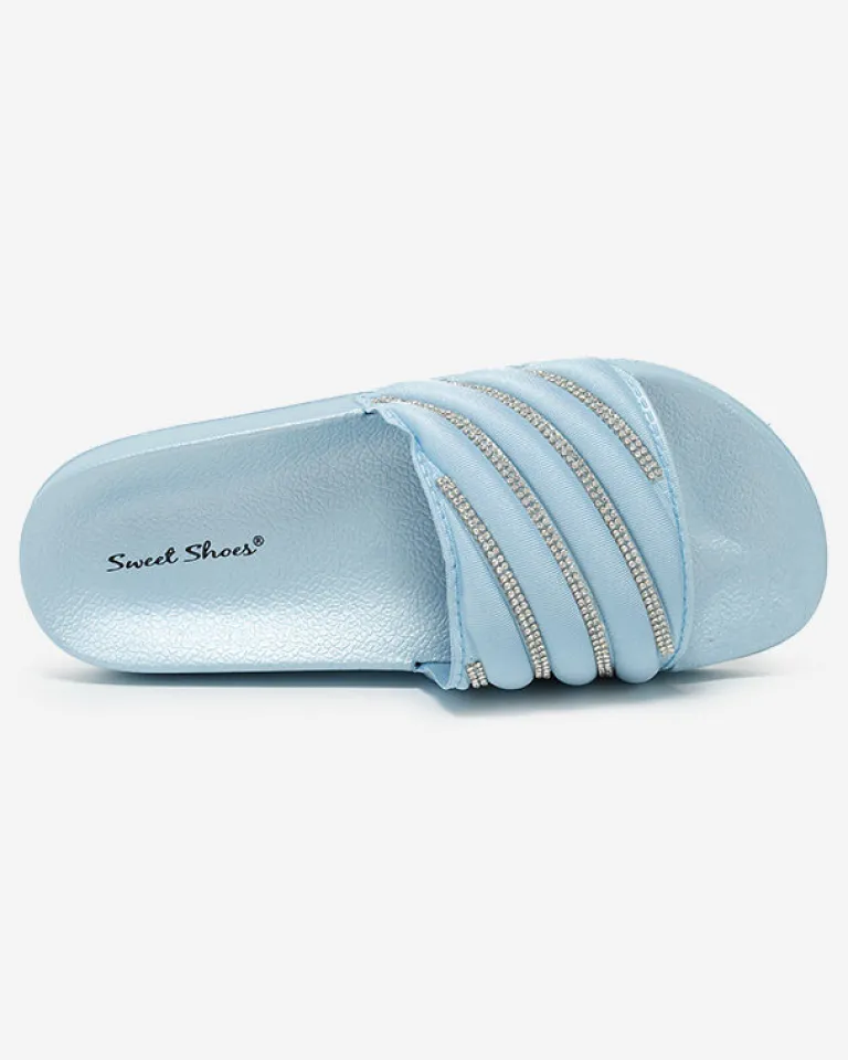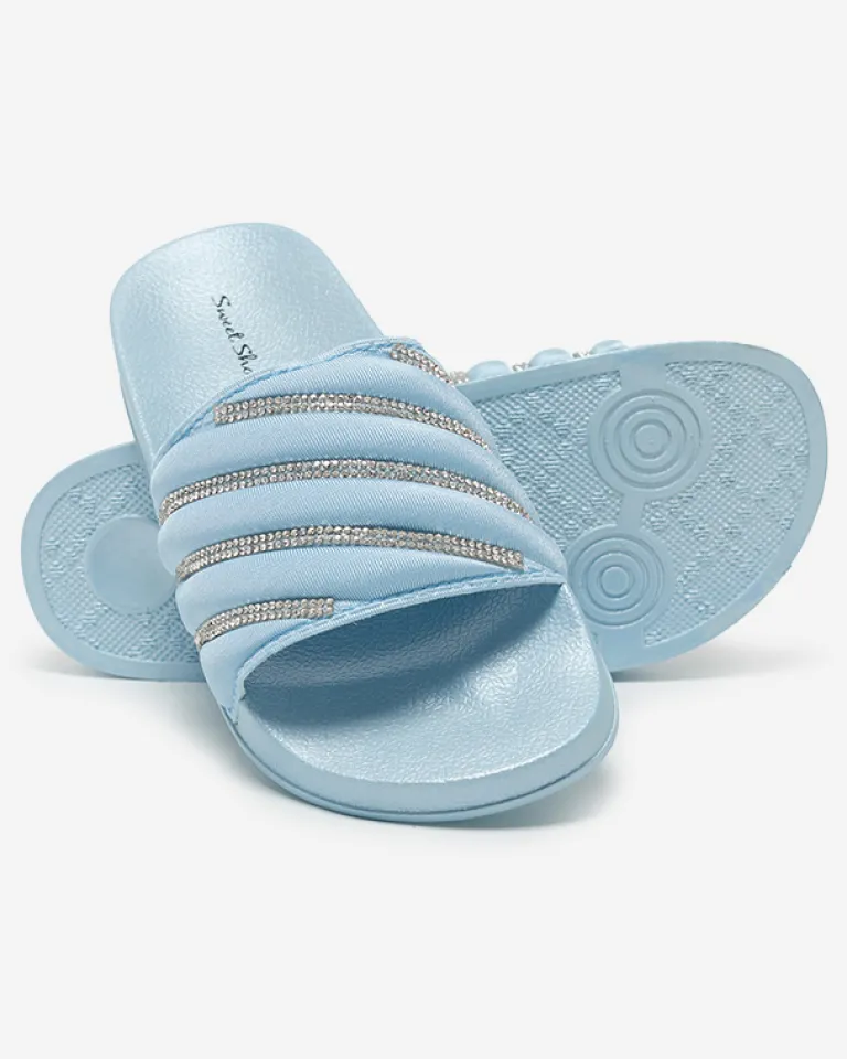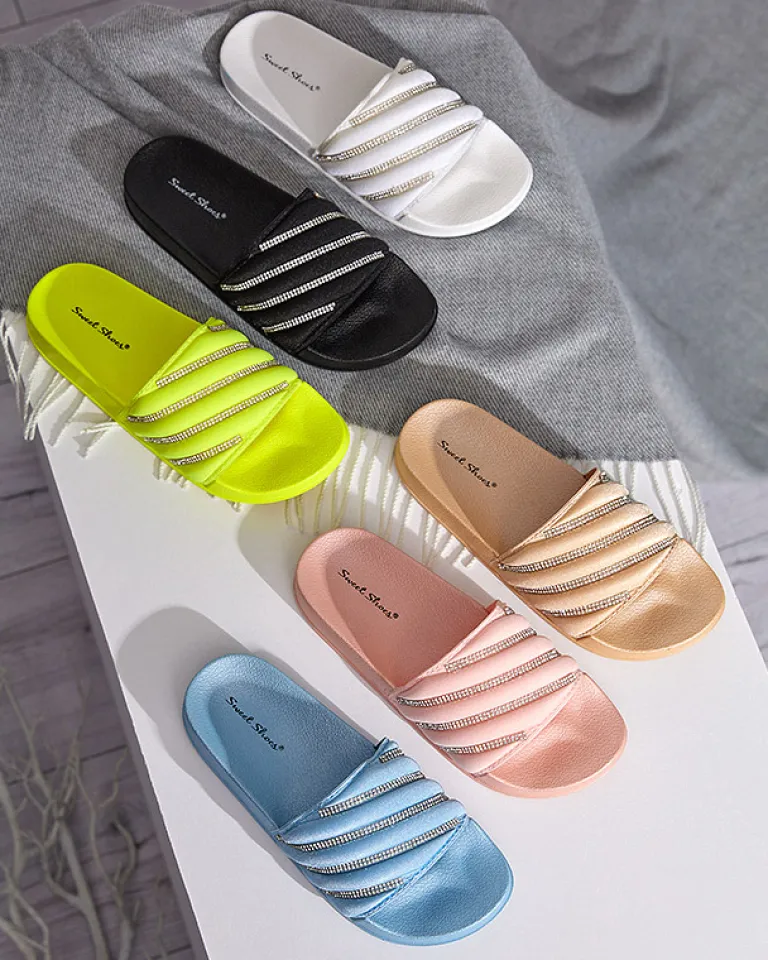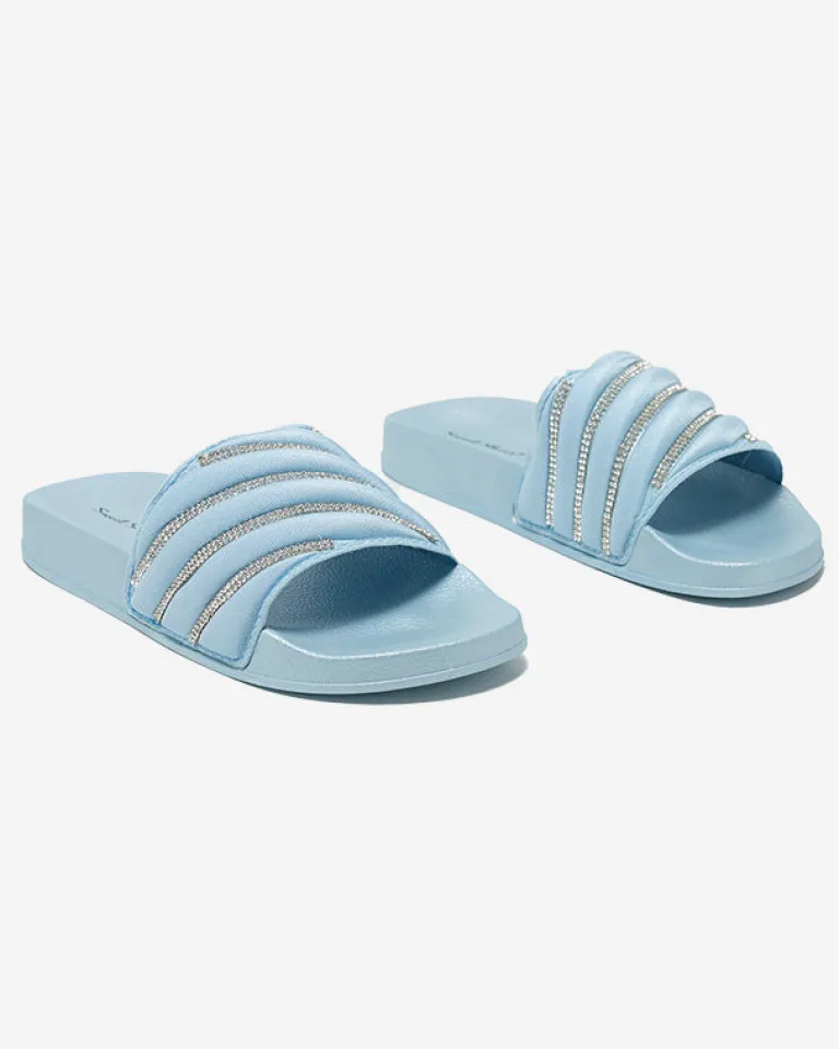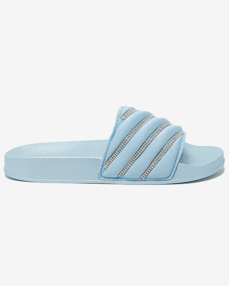 - Przepiękne damskie klapki na płaskiej podeszwie, zdobione drobnymi cyrkoniami. Cholewka wykonana z materiału tkaninowego, zaś wkładka wykonana z tworzywa gumowego. Ta piękna para musi znaleźć się w Twojej walizce podczas urlopu!