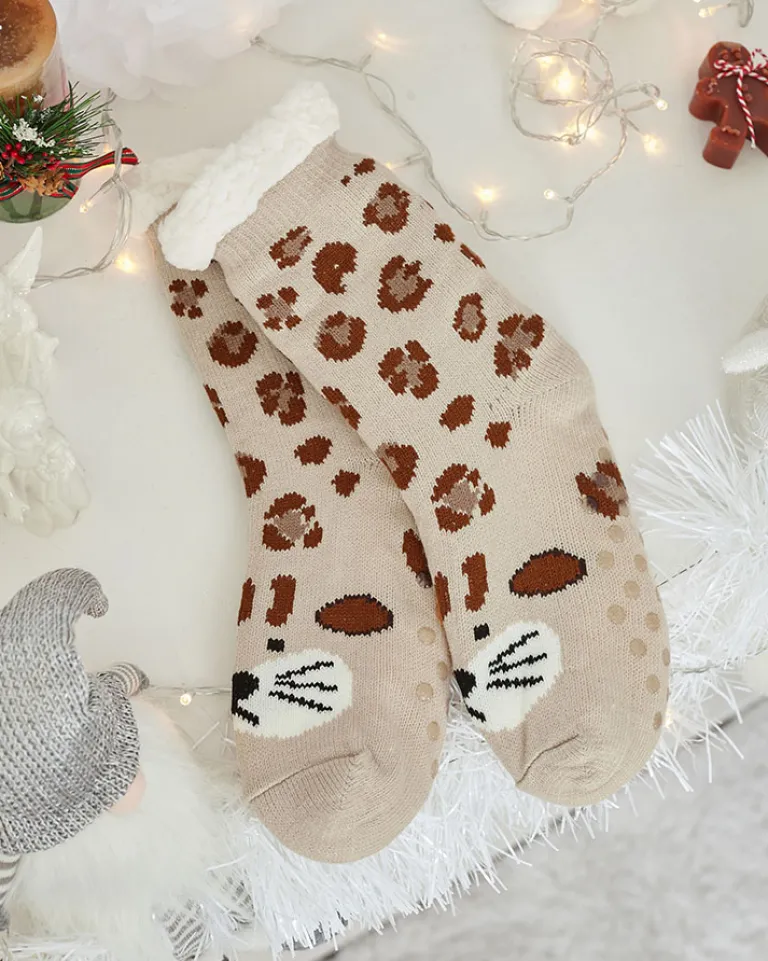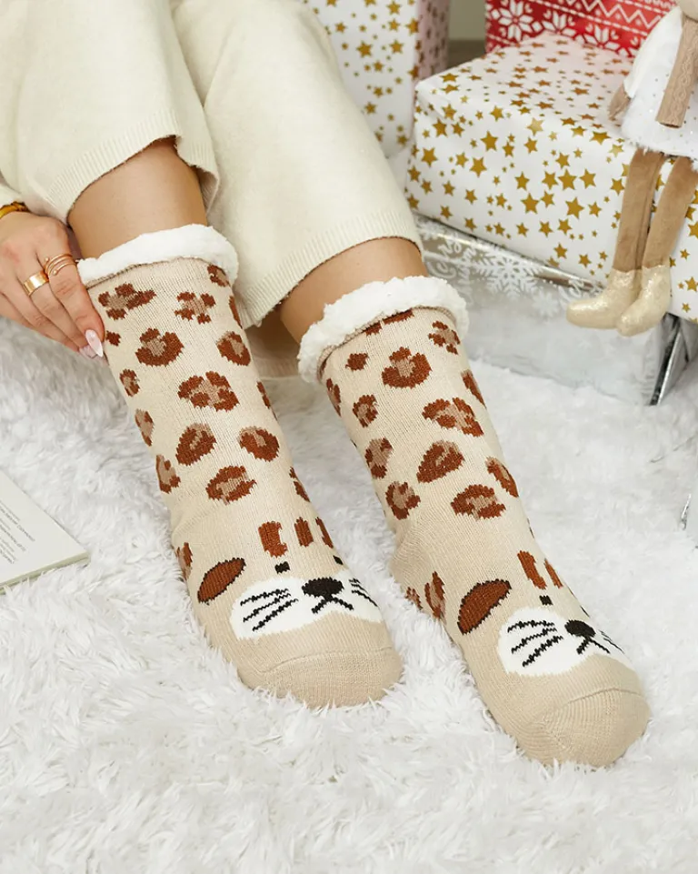 - Przepiękne damskie grube skarpety wykończone printem. W środku ocieplane białym, cieplutkim kożuszkiem. Skarpetki świetnie się sprawdzą na chłodniejsze wieczory!