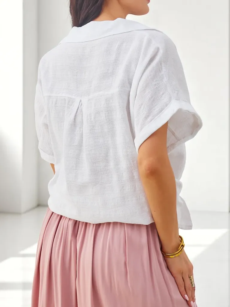 - Bawełniana koszula damska z tłoczeniem z krótkimi rękawami. Model z dekoltem w serek, jest zapinany na guziki. Must have w szafie każdej kobiety!