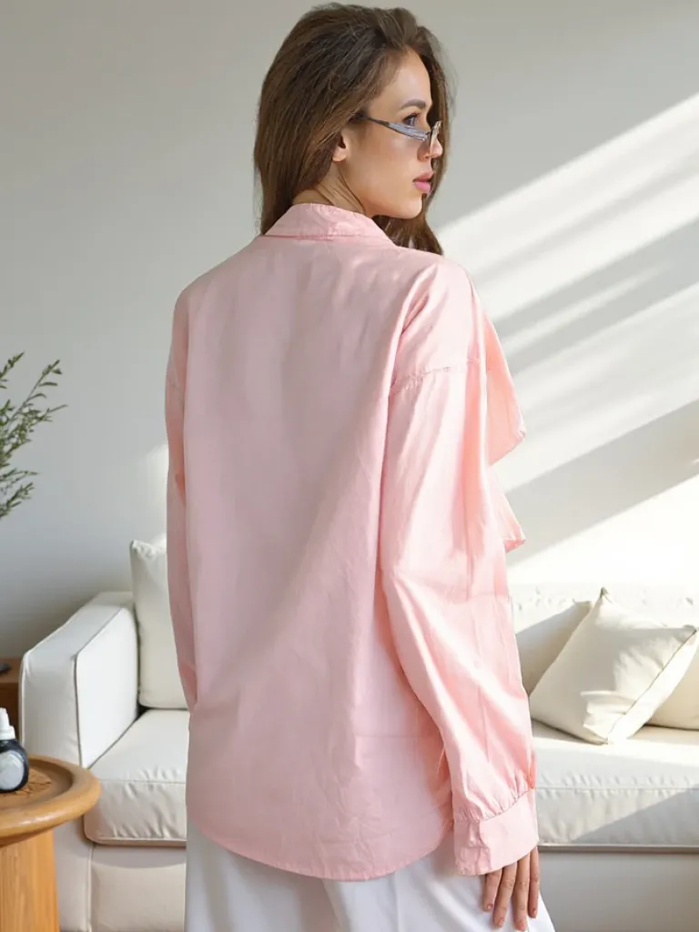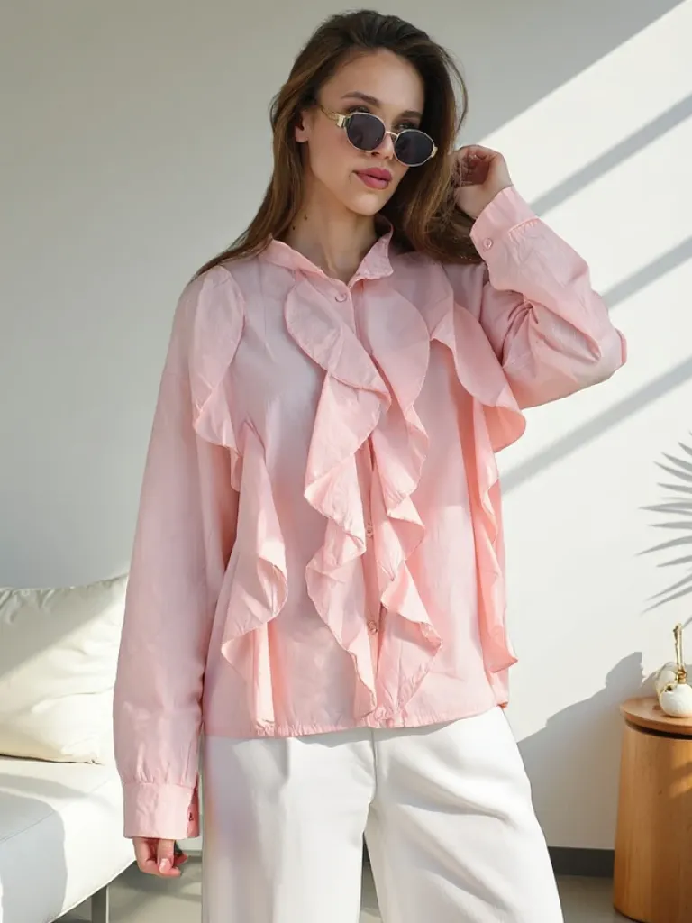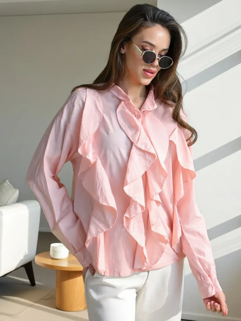 - Klasyczna damska koszula z długimi rękawami. Model z okrągłym dekoltem, jest zapinany na guziki. Całość zdobiona pięknymi falbankami. Must have w szafie każdej kobiety!