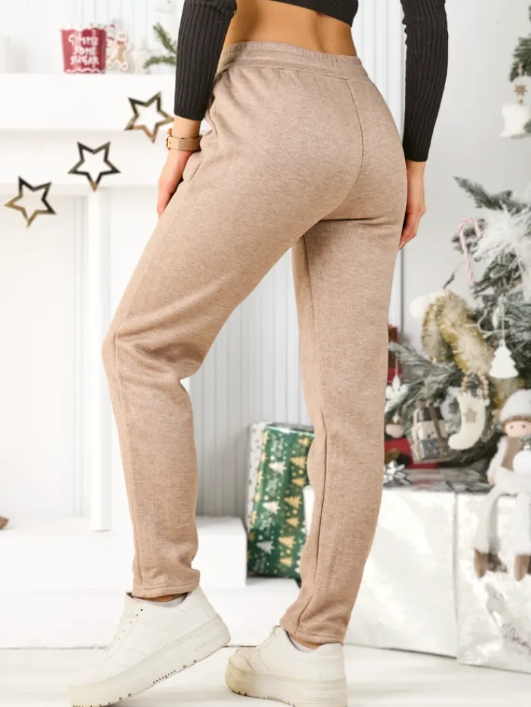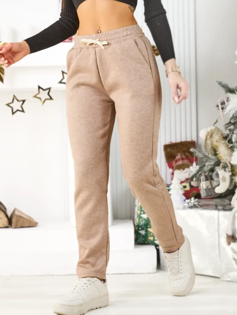 - Ponadczasowe damskie spodnie dresowe, wykonane z miękkiego, prążkowanego materiału. Model o prostym kroju, posiada dwie wsuwane kieszenie i gumę w pasie i troczki. Idealny wybór na co dzień!