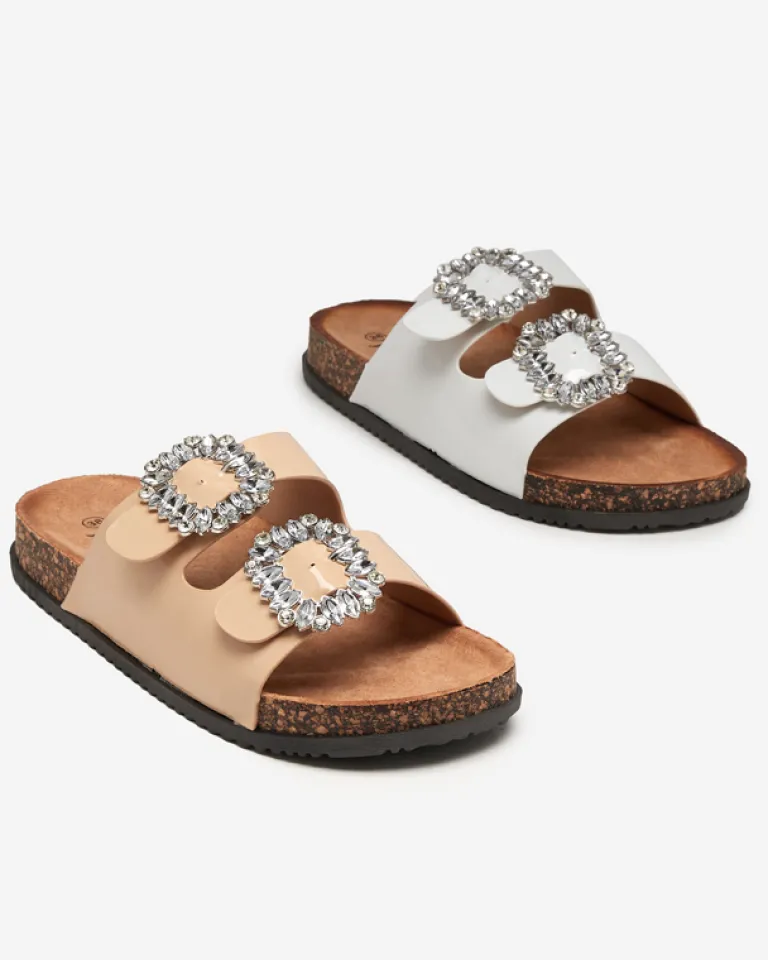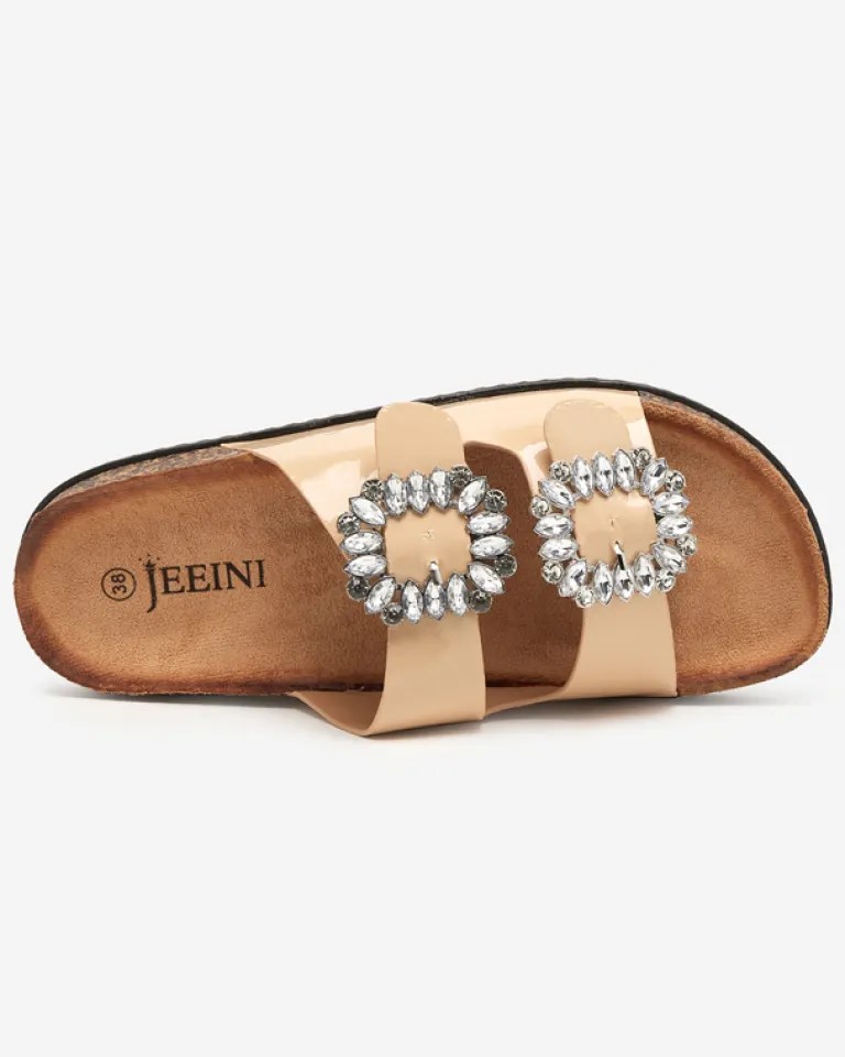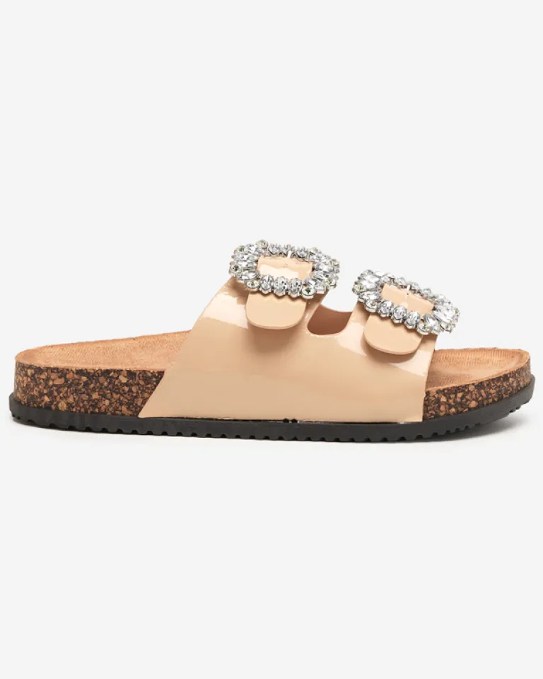 - Prześliczne damskie klapki wykonane ze skóry ekologicznej lakierowanej. Model z klamrami zdobionymi cyrkoniami, posiadają eko-zamszową wkładkę. Gumowa podeszwa zdobiona materiałem a’la korek. Super dodatek do Twoich casualowych outfitów!