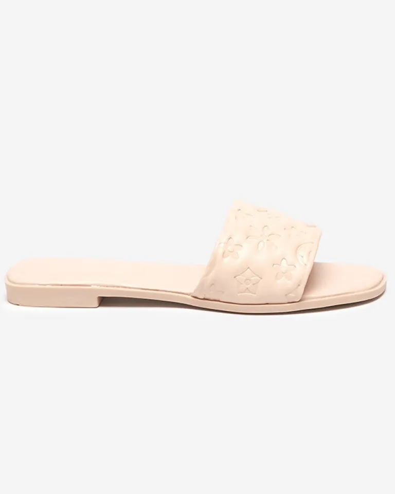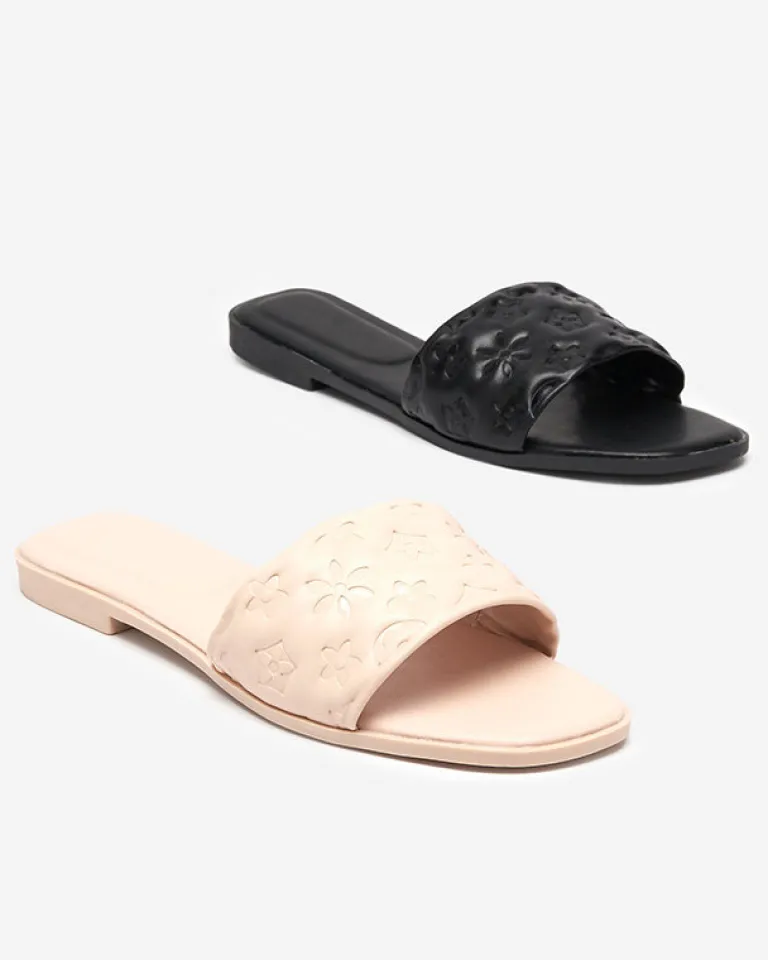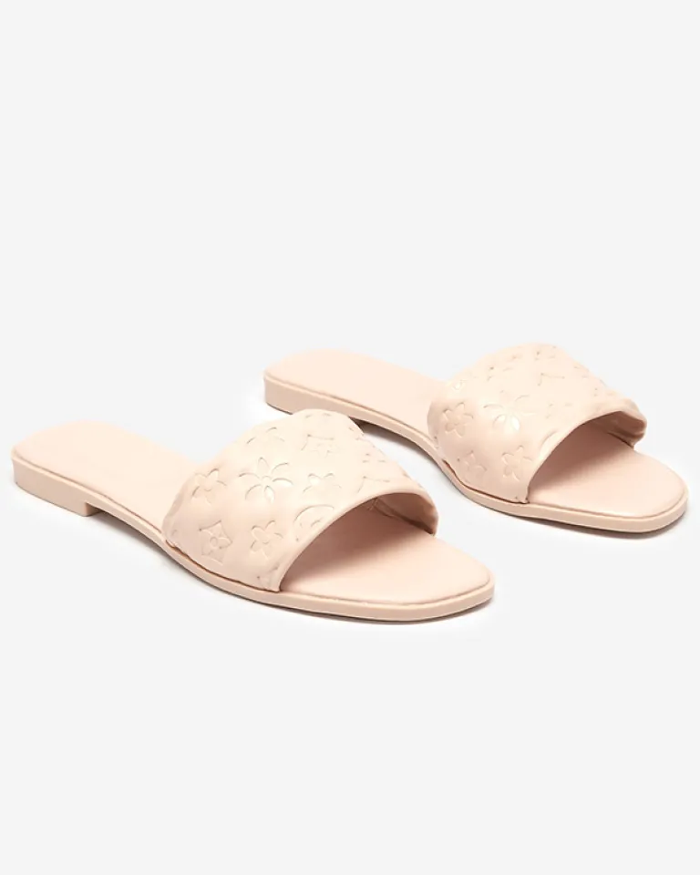 - Wyjątkowe klapki z tłoczeniem na paseczku, wykonane ze skóry ekologicznej. Wkładka to również eko-skóra, podeszwa jest gumowa. Idealne na lato!