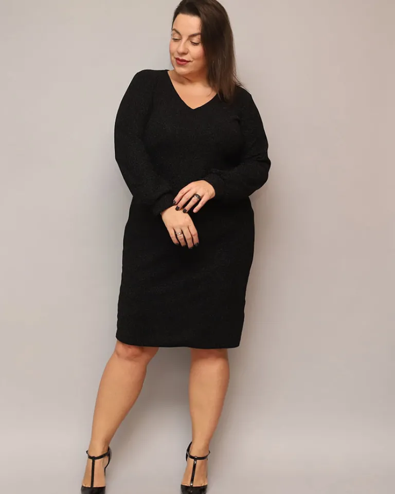 - Rewelacyjna sukienka damska przed kolano wykonana z elastycznego materiału pokrytego brokatową nicią. Model posiada długie rękawy i dekolt V. Błysk dodaje jej charakteru!