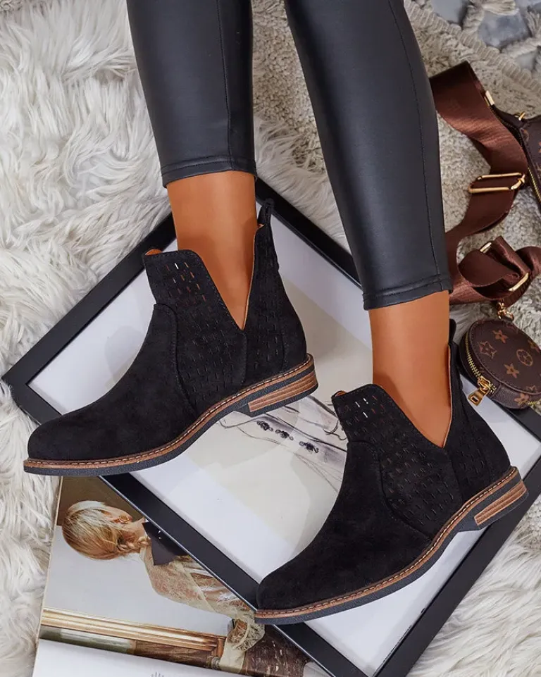 - Botki na płaskiej podeszwie – styl i wygoda w jednym. Wycięcie przy kostce ułatwia zakładanie. Całość wykonana ze skóry ekologicznej zamszowej oraz skóry naturalnej w środku. Ten model doda Ci pewności siebie!
