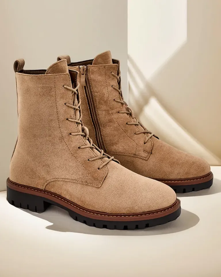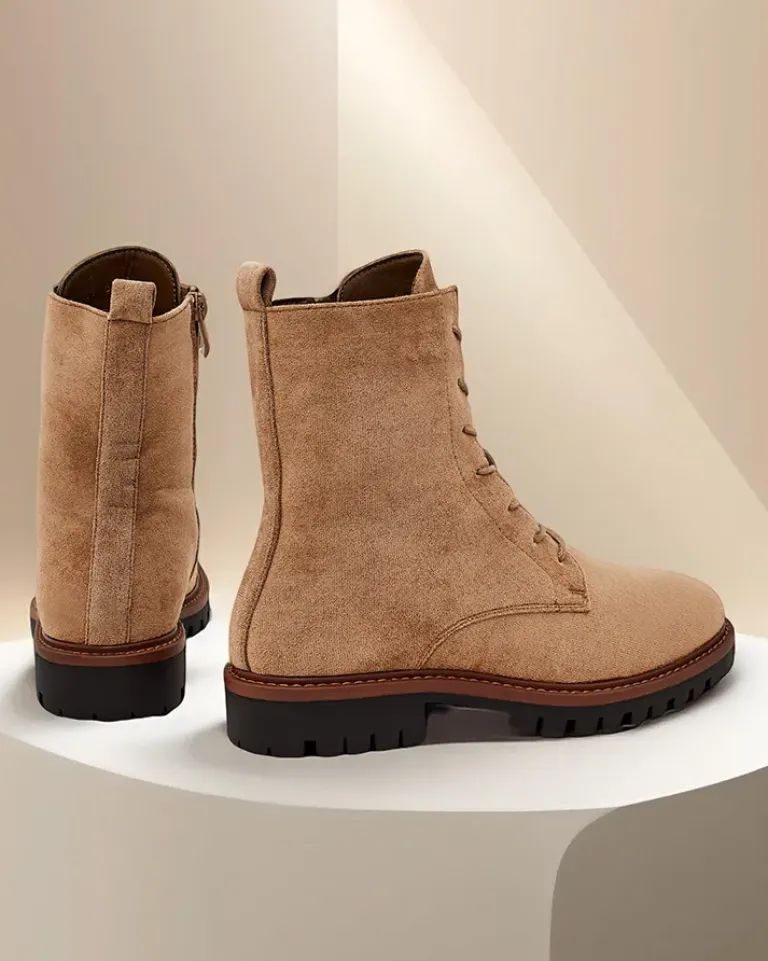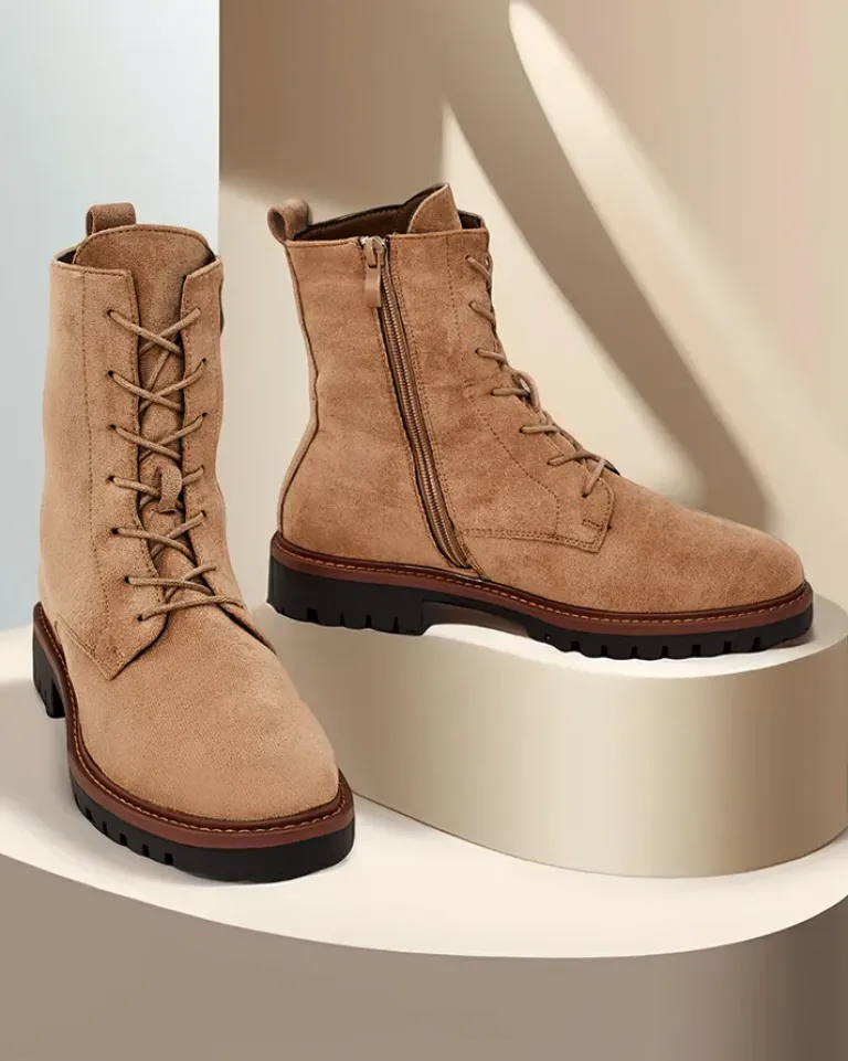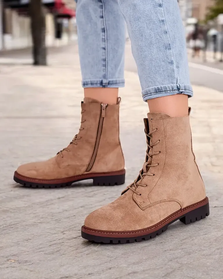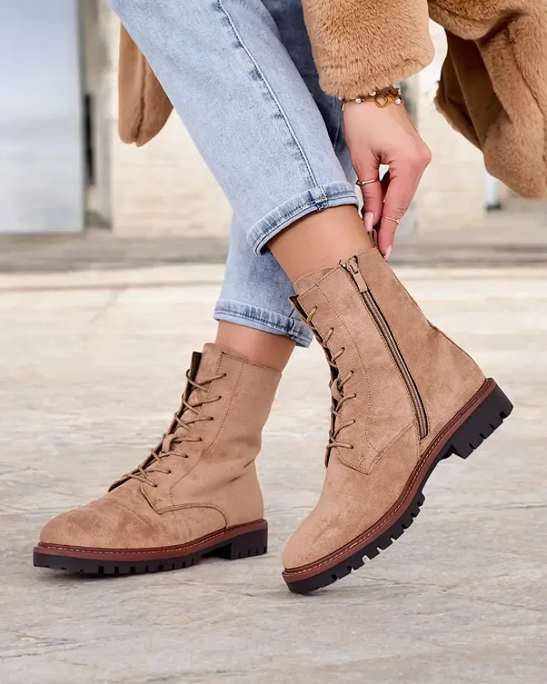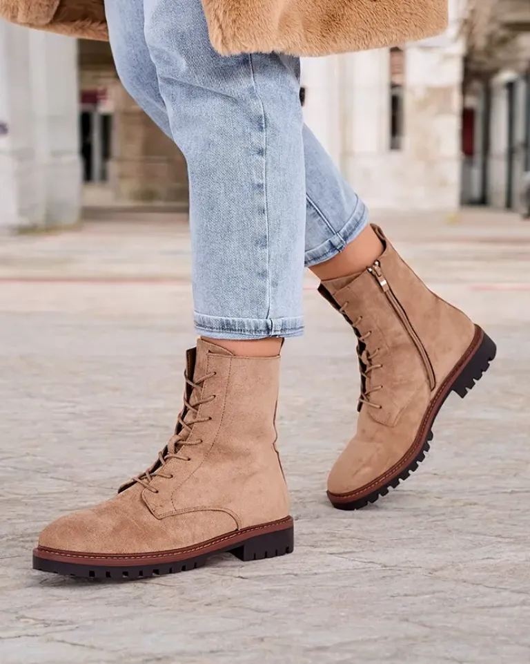 - Stylowe botki wykonane z eko skóry zamszowej. Buty są sznurowane. Model posiada grubszą podeszwę oraz futerkowe wypełnienie. Idealne na jesień!