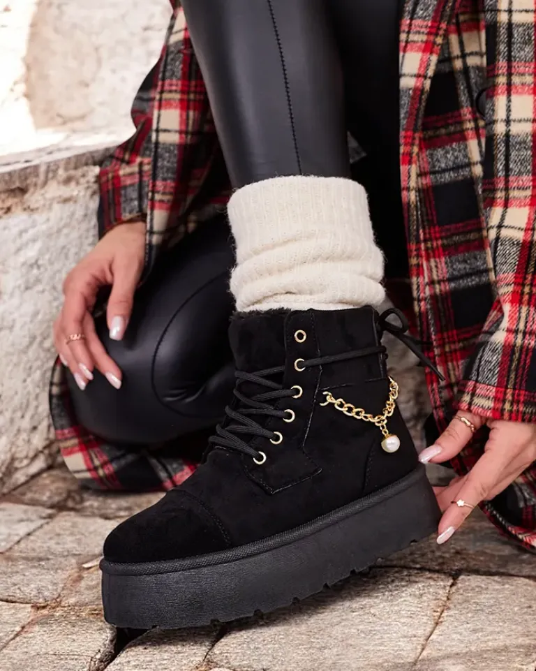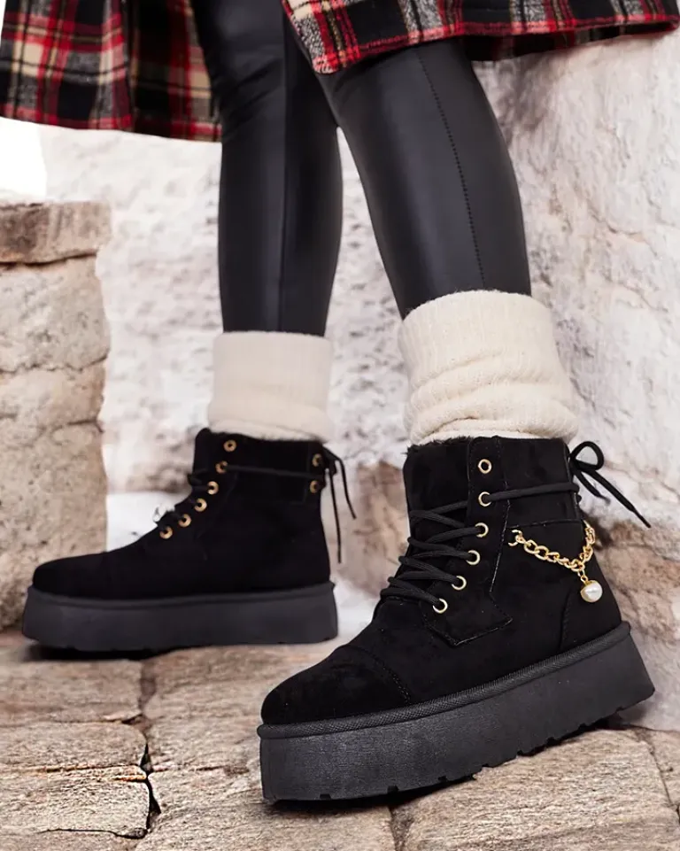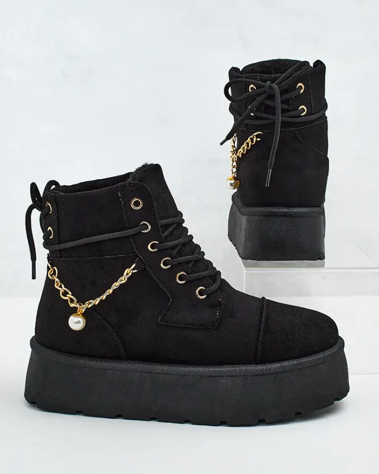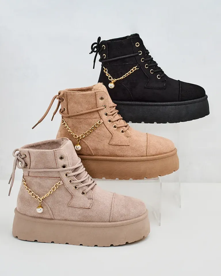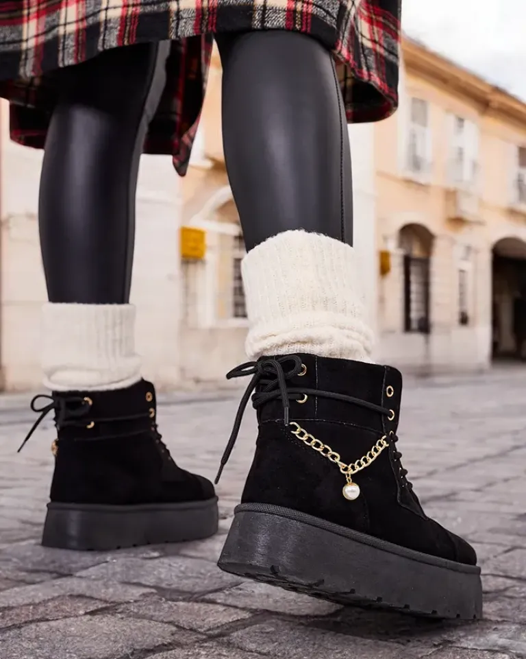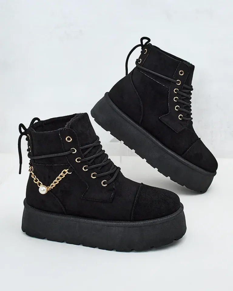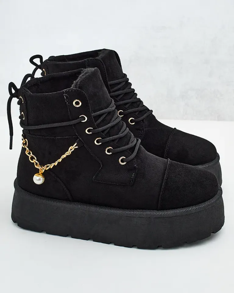 - Stylowe botki typu workery wykonane z eko skóry zamszowej. Buty są sznurowane. Model posiada platformę oraz futerkowe wypełnienie. Idealne na jesień!