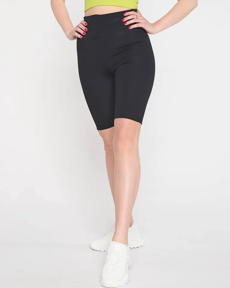 - Damskie krótkie spodenki treningowe typu kolarki, wykonane z grubej tkaniny prążkowanej. Model z wysokim stanem oraz gumką w pasie. Sprawdzą się doskonale na rower!