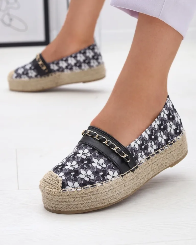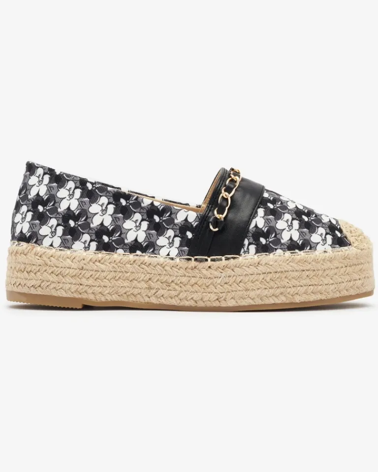 - Rewelacyjne wielokolorowe espadryle, które w całości wykonane są z tkaniny. Nosek zdobiony łańcuszkiem. Podeszwa pokryta plecionym sznurkiem jutowym. Świetne na letni spacer.